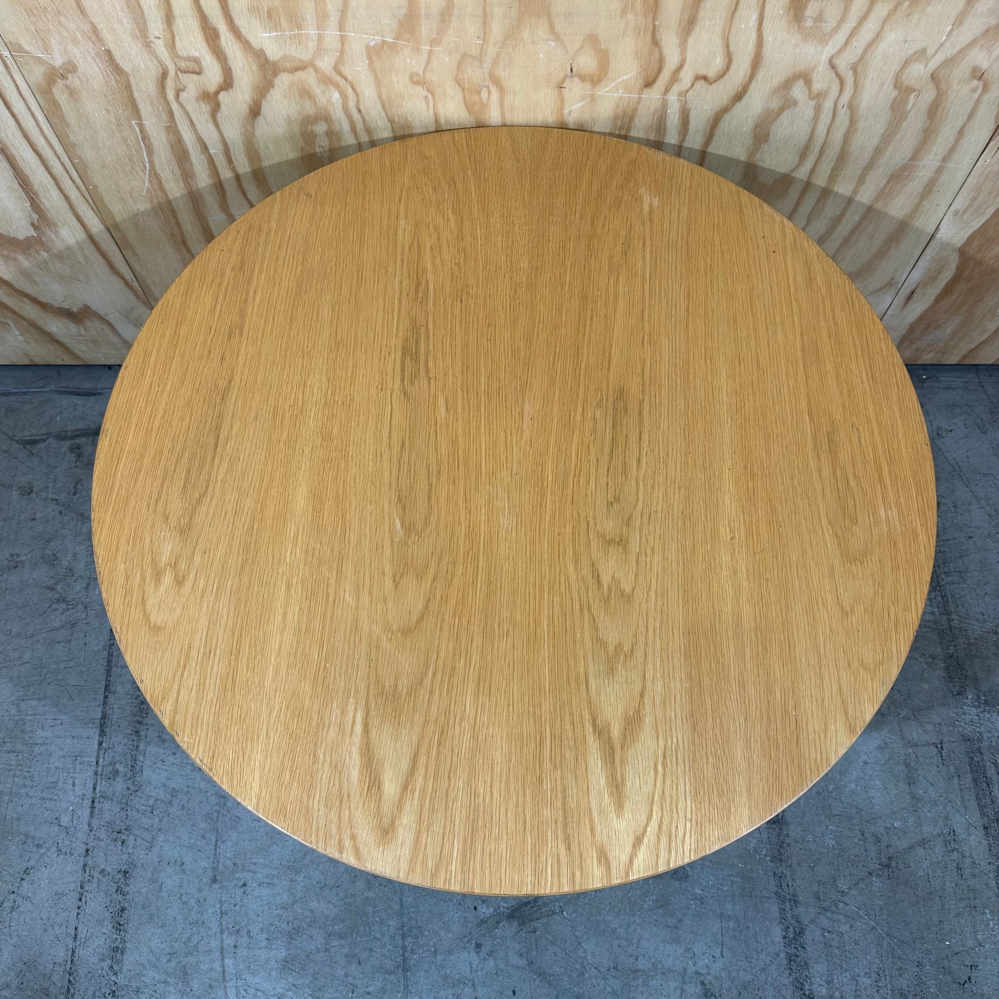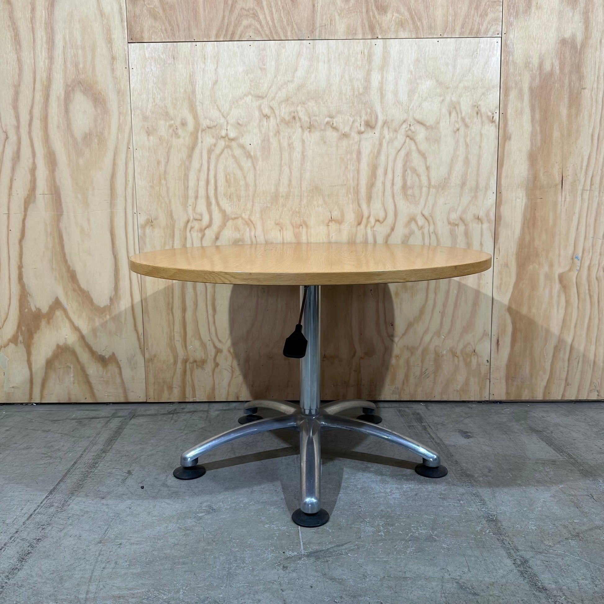 Own a versatile table built for dynamic spaces. Its circular top features a durable light oak veneer, providing a warm, professional aesthetic. Stability comes from a polished aluminium four-star pedestal base, ensuring balance on any floor surface. Crucially, the height adjustment mechanism allows you to transition the piece effortlessly between standard side table, coffee table, or standing meeting heights. Rubberised feet protect your flooring and keep the table stationary during use. This piece is ideal for modern, multi-purpose workspaces where flexibility is essential.