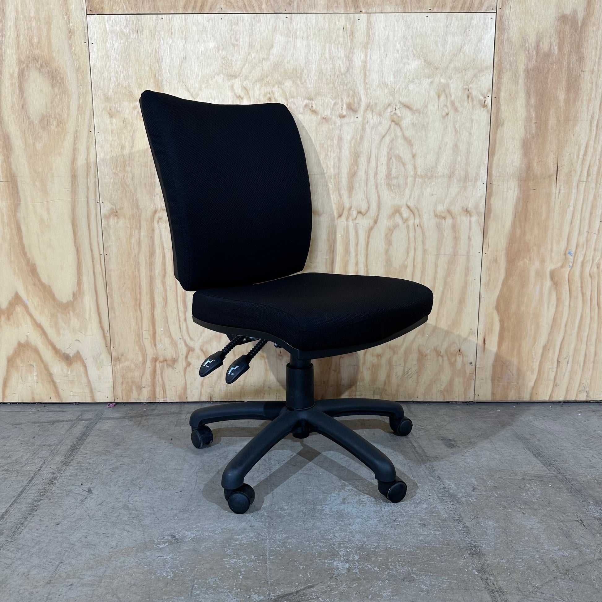 You control every aspect of your posture with this robust 3-lever ergonomic chair. Three independent levers on the right side allow you to adjust the seat height, seat angle, and back angle separately to suit your specific body requirements. A high backrest provides extensive spinal coverage and dedicated lumbar support for long work sessions. High-density moulded foam in the seat ensures the cushion retains its shape and comfort over years of daily use. Its armless design allows you to slide the chair completely under a desk to maximise floor space in smaller rooms.