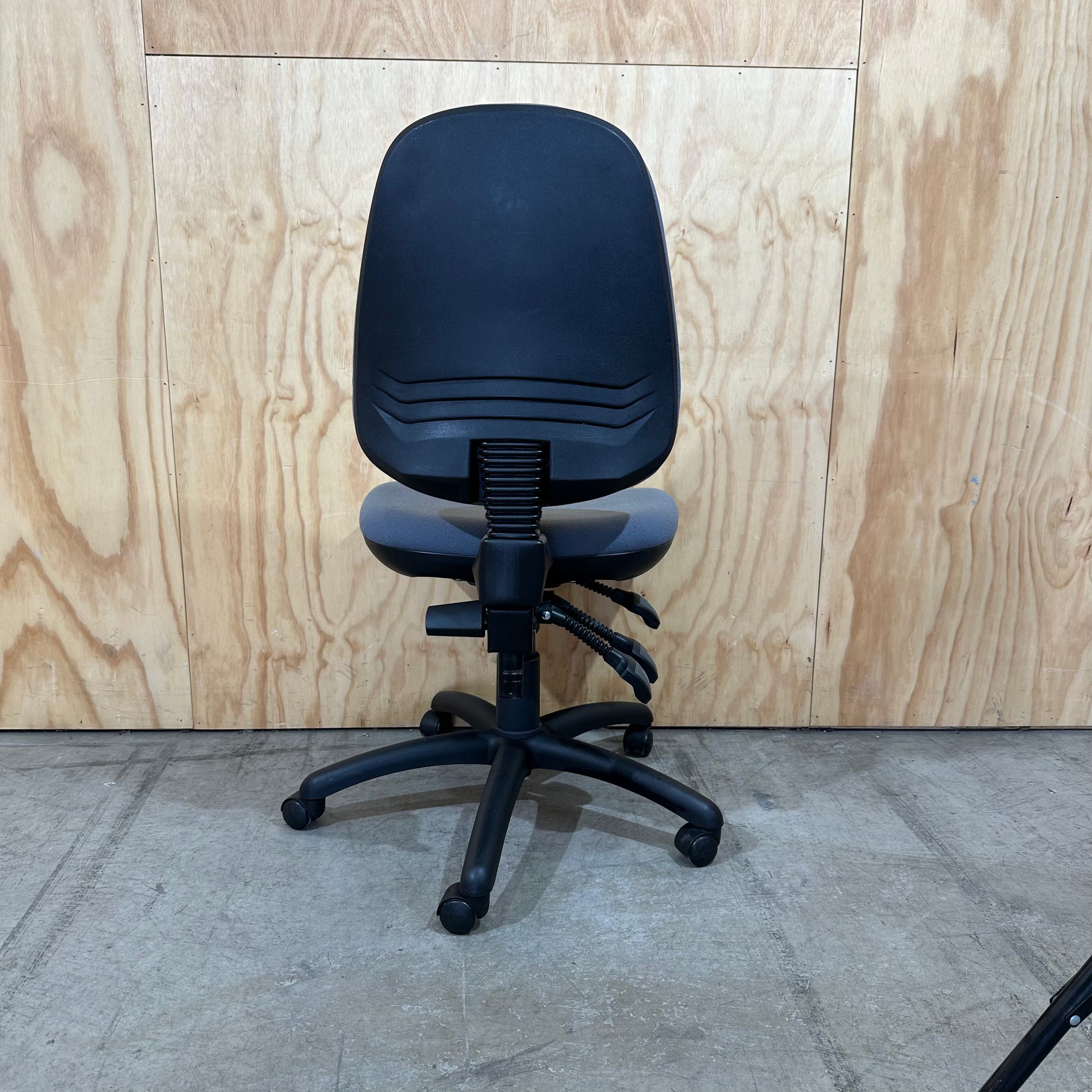 This is a functional and dependable highback task chair, upholstered in a durable blue/grey commercial-grade fabric. Contoured seat padding provides support for extended sitting periods. Its backrest is high, providing excellent upper back support, and the black five-star nylon base ensures stability and smooth mobility on casters. A three-lever mechanism controls seat height, back tilt, and back height, allowing you to customise the chair for optimal ergonomic positioning. The chair presents as a clean, basic, and robust office seating solution.