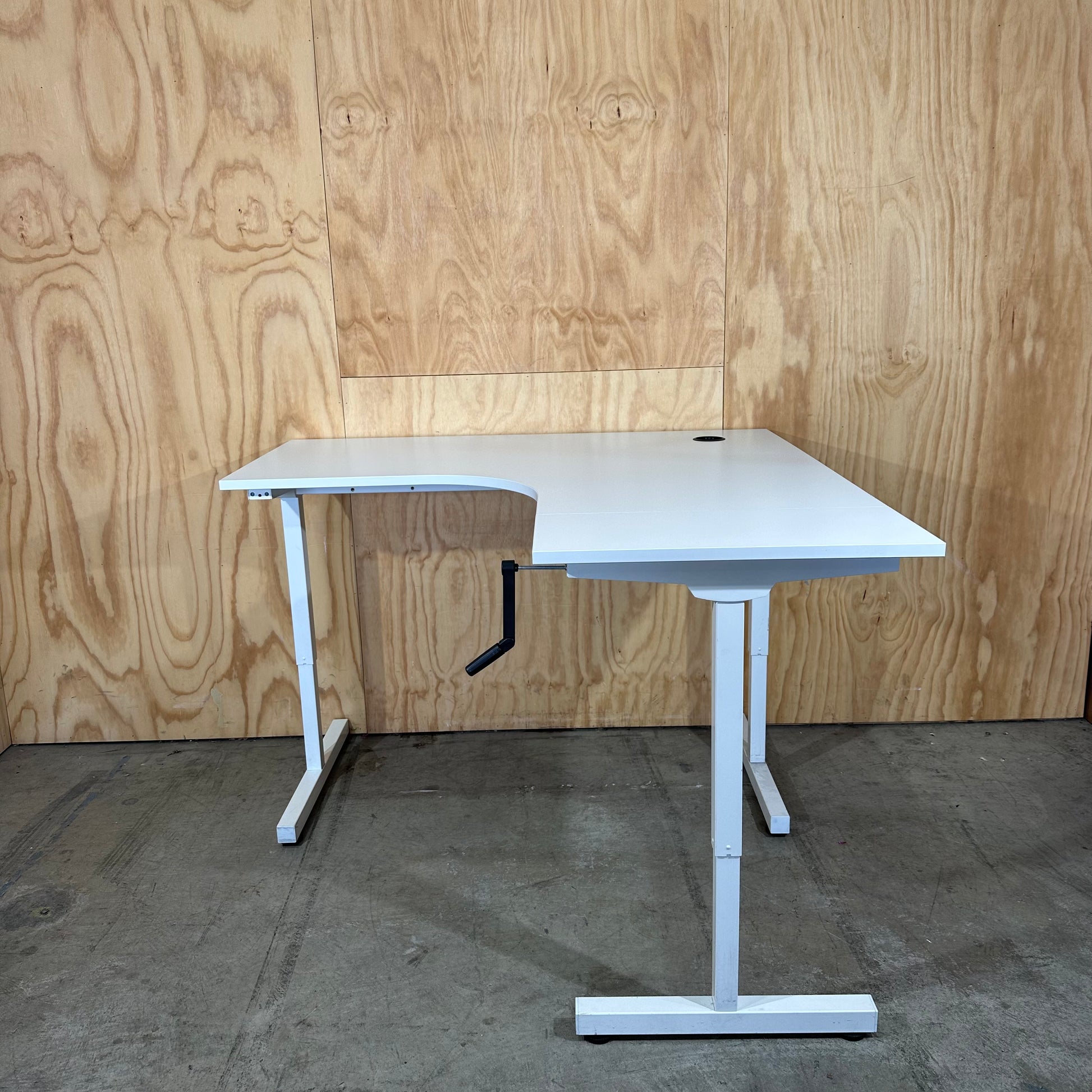 Presenting a highly versatile manual corner sit-stand desk, ideal for optimising your workspace. The clean white L-shaped desktop provides ample surface area for multiple monitors and equipment. You can effortlessly adjust the working height from a seated to a standing position using the integrated black manual crank handle. The robust white powder-coated steel frame ensures a stable platform throughout its range of motion. A single cable grommet simplifies wire management, maintaining a tidy look. This ergonomic workstation promotes movement and better posture, increasing your focus and overall productivity.