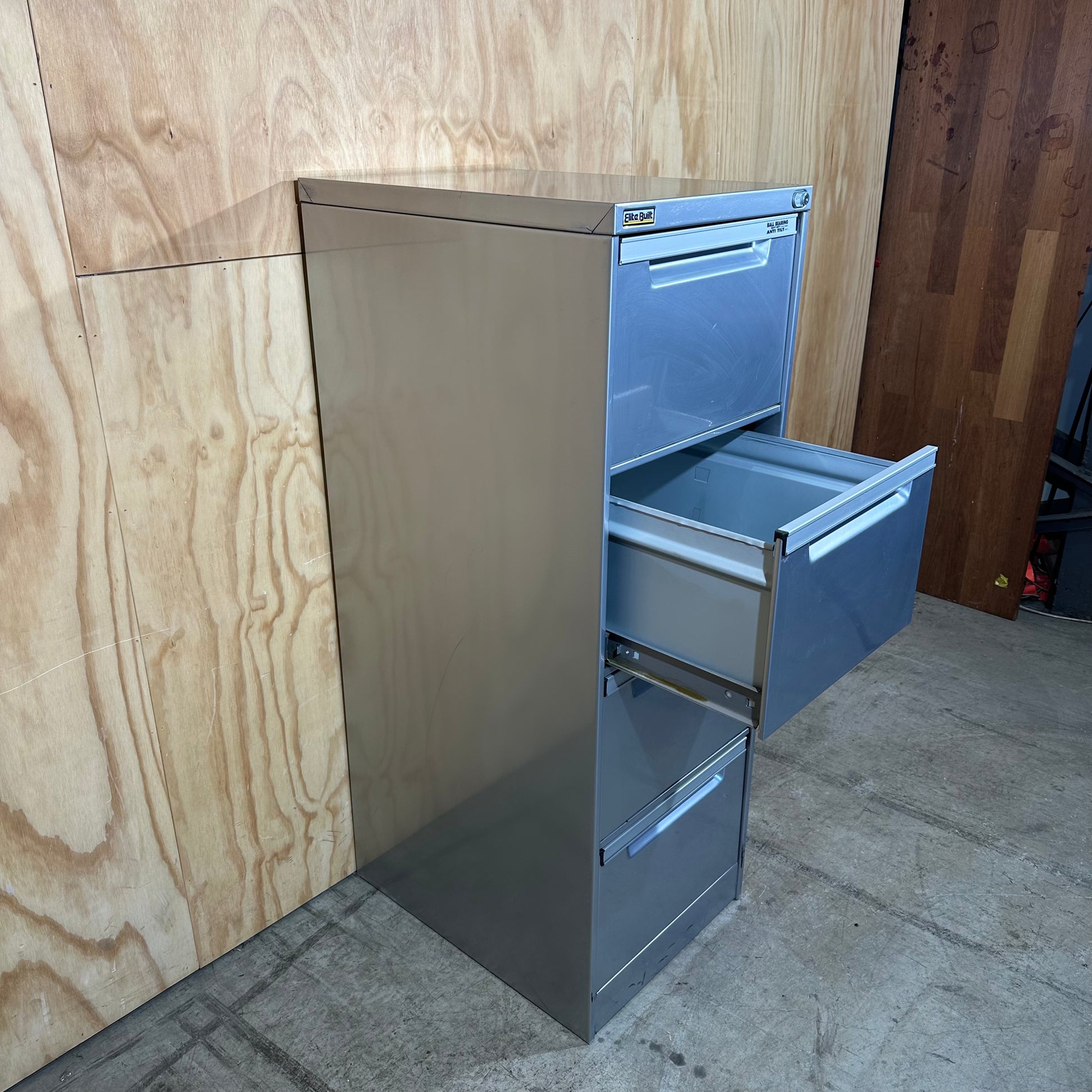 The Elitebuilt 4-drawer vertical filing cabinet is a durable storage solution constructed from heavy-gauge steel. Finished in a grey powder coat, it features a heavy-duty ball-bearing runner system for smooth drawer operation. The cabinet also includes an Anti-Tilt Safety System, which prevents more than one drawer from opening at a time.