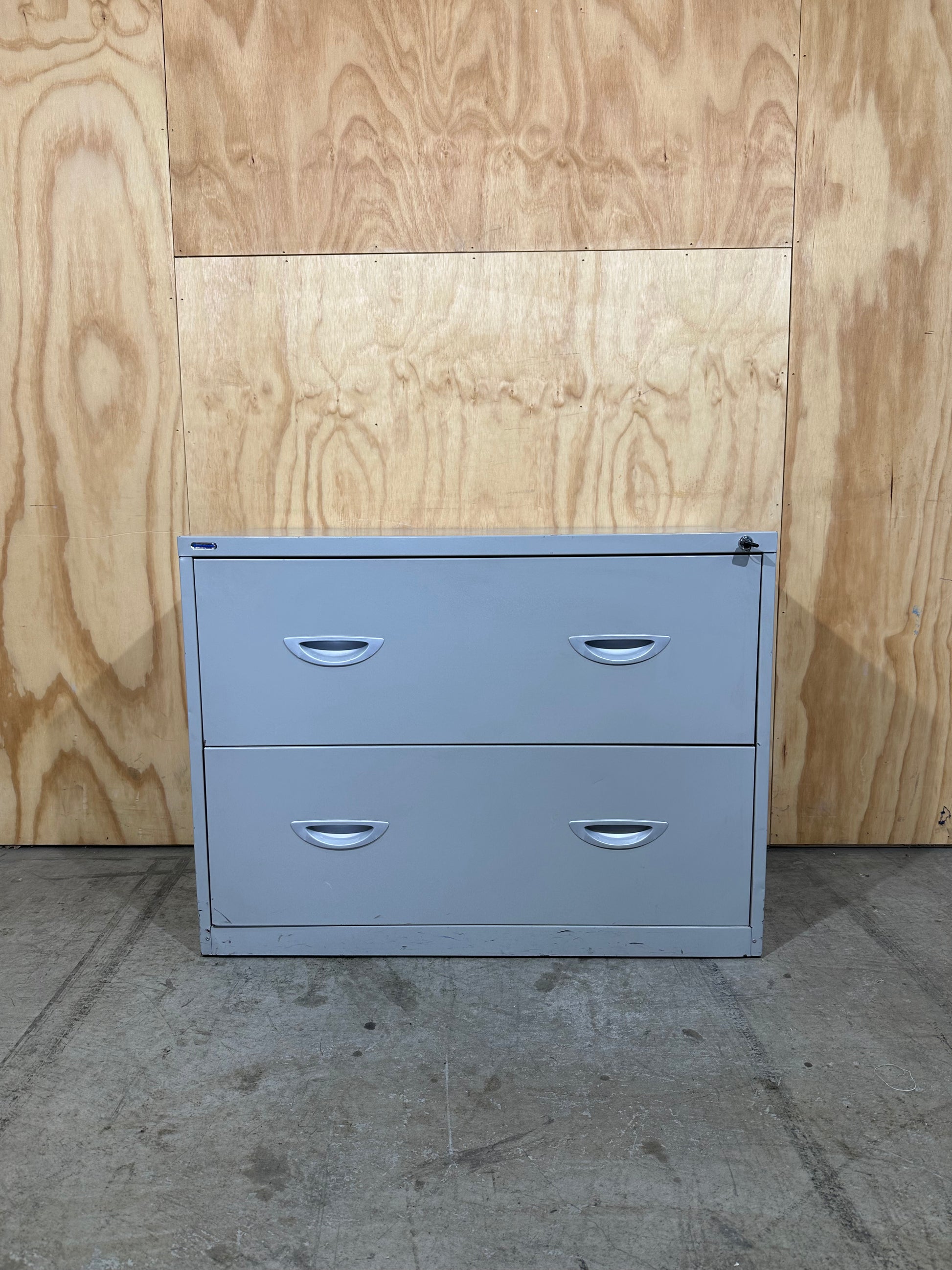 Presenting a robust, commercial-grade lateral filing cabinet by Endurance. Constructed from durable metal, the cabinet features two generously sized drawers designed for efficient document organisation. The light grey powder-coated finish offers a professional appearance, suitable for any modern office environment. Each drawer operates smoothly on reliable runners and features recessed handles for a sleek, streamlined look. The unit includes a secure central lock mechanism, located on the top right, providing secure storage for sensitive files. Its low-profile, lateral design maximises storage volume while maintaining a stable footprint. This unit accommodates foolscap filing, a common standard for Australian office documents.