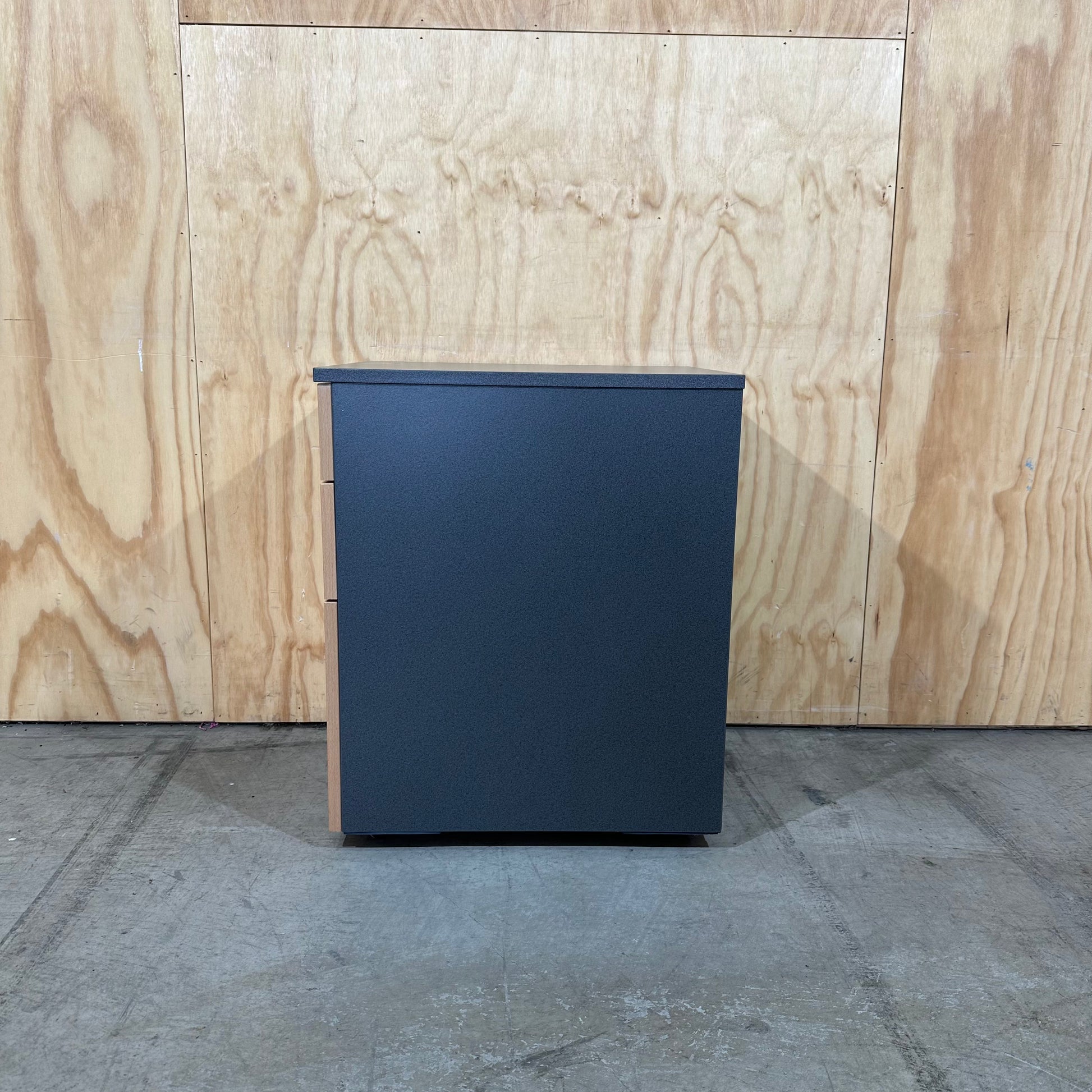 This contemporary three-drawer mobile pedestal combines a professional dark grey body with light oak-look melamine drawer fronts for a modern, sophisticated aesthetic. It features two shallow stationery drawers and one deep file drawer, offering versatile storage for your office essentials and suspension files. The top drawer includes a lock, securing all three drawers simultaneously for confidential items. Black handles and hidden castors ensure a clean look and easy mobility under any desk.