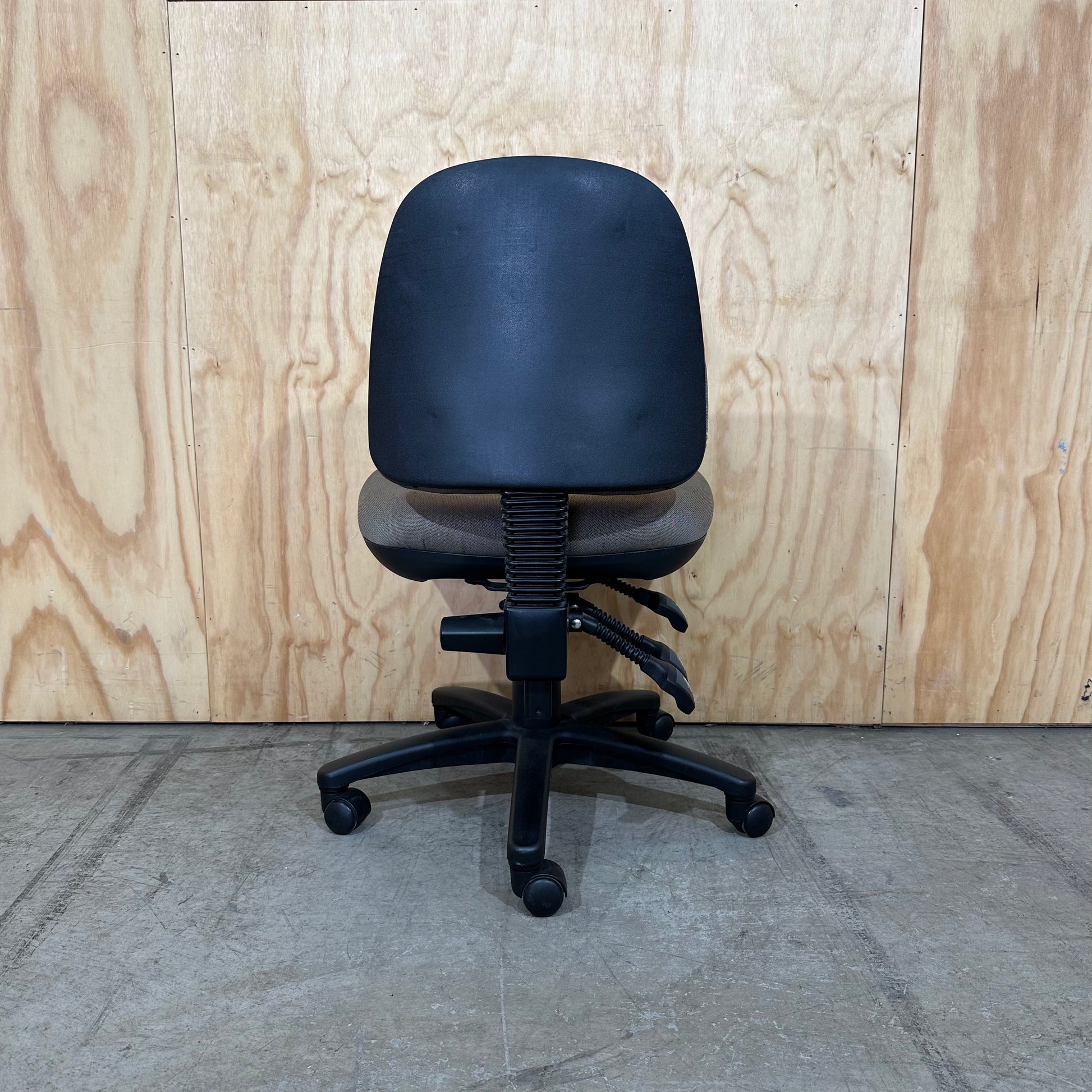 Fully ergonomic task chair presents a medium back and contoured seat, both upholstered in durable grey fabric. The chair features a powerful three-lever mechanism, allowing independent adjustment of the seat height, seat angle, and backrest angle, essential for finding your perfect custom fit. A robust black five-star nylon base provides stability, complete with smooth-rolling twin-wheel castors for easy mobility. This model, often built with commercial-grade components and injection-moulded foam, offers enduring comfort and support for daily use.