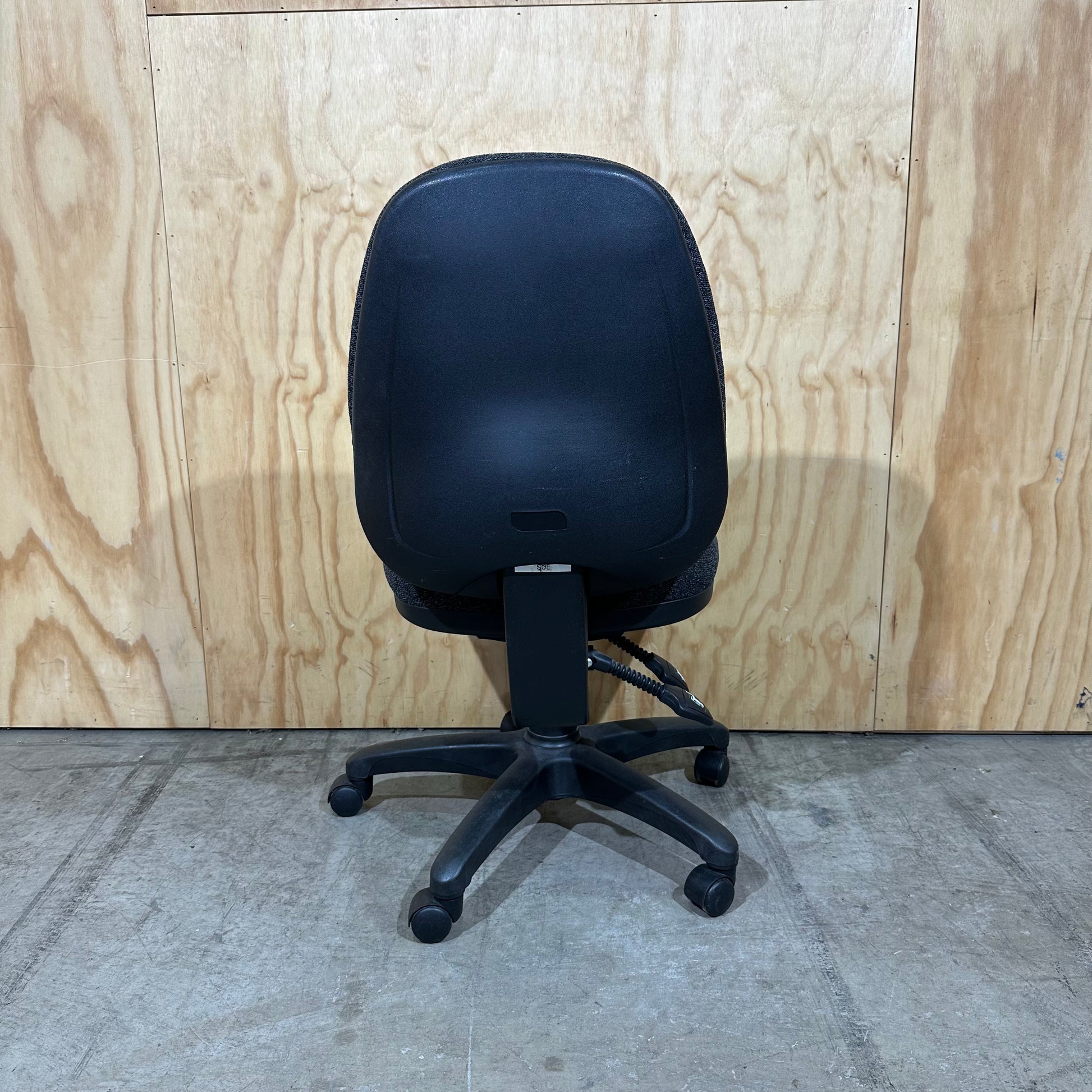 A dependable task chair, upholstered in durable black commercial-grade fabric. The contoured backrest provides essential support for the user's lower back. Equipped with a two-lever mechanism, you control both the gas-lift seat height and the back tilt angle. A robust black nylon five-star base with dual-wheel castors ensures smooth mobility across various floor surfaces. This chair offers practical, no-fuss seating built for daily use.