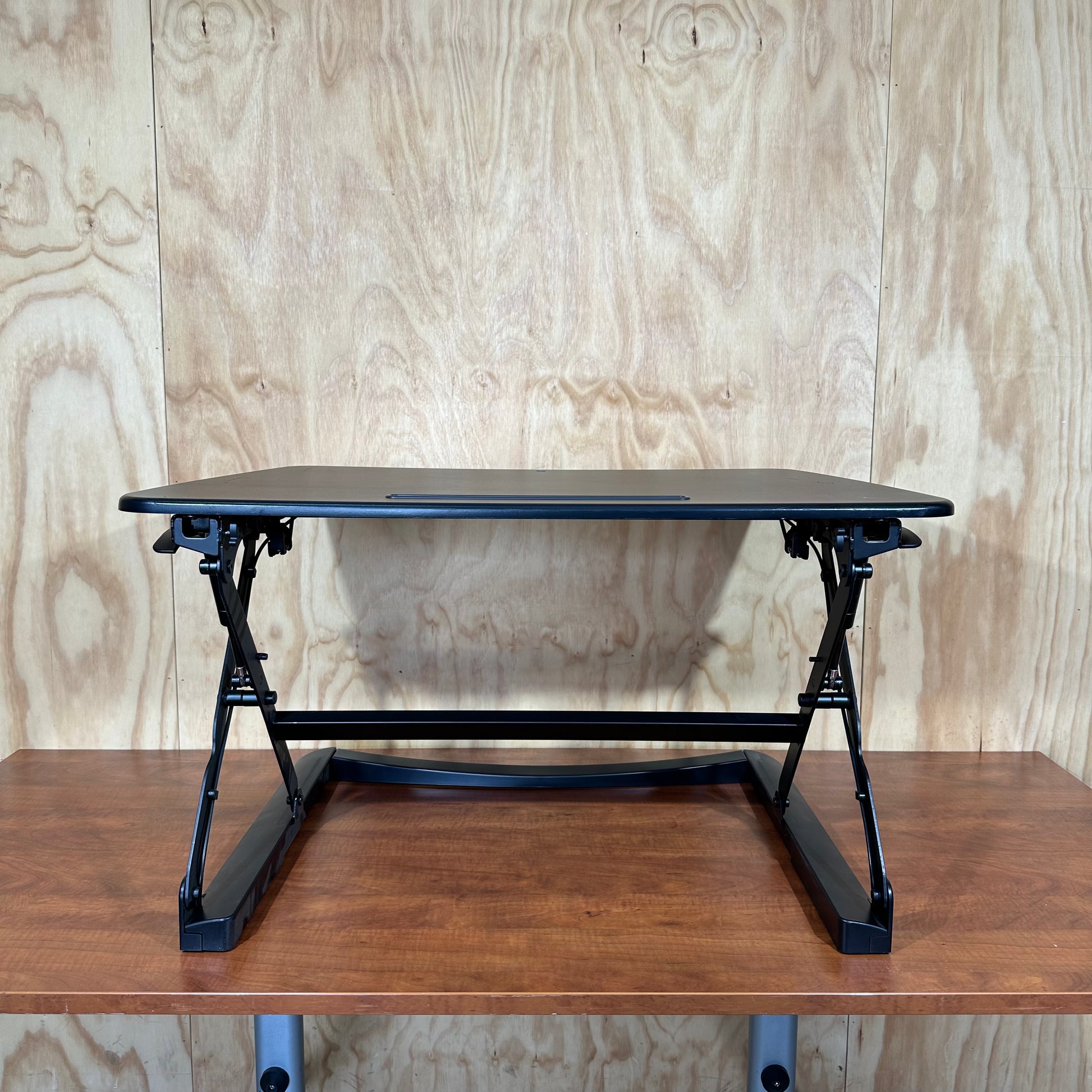 A black, sleek, portable laptop desk riser provides a simple solution for a flexible workspace. Surface features a gentle curve, offering comfortable wrist support for typing. Sturdy folding legs lock securely, quickly converting any surface into an ergonomic workstation. The compact design allows for easy storage and transportation, promoting a healthier posture by elevating your laptop screen to eye level. A long slot holds a tablet or smartphone, keeping your devices visible and organised while working.