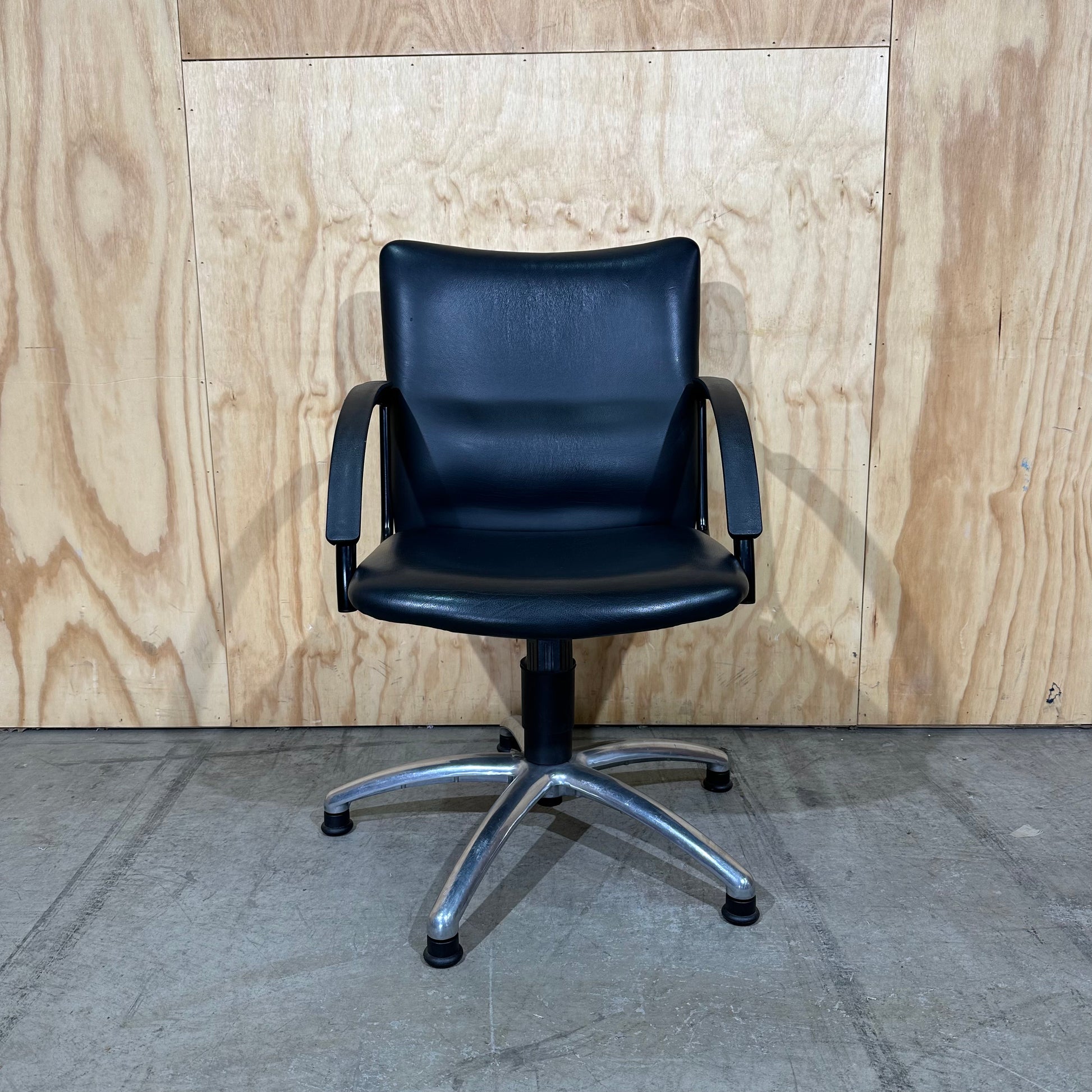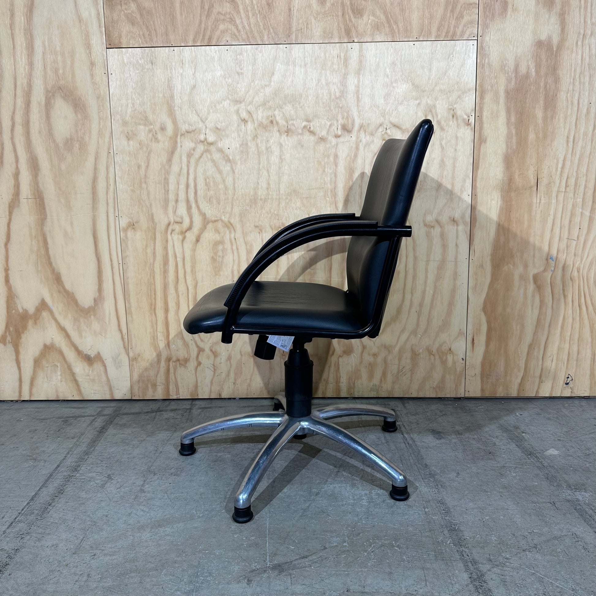 Modern executive chair features sleek black leather upholstery for a professional aesthetic. Built on a durable polished aluminium five-star base, this chair ensures stability and smooth movement. Fixed height armrests provide consistent support. The chair includes a gas lift for easy height adjustment, adapting quickly to your desk. Comfortable padding in the seat and back supports long periods of sitting. Clean lines and minimal design offer a sophisticated look without distraction.