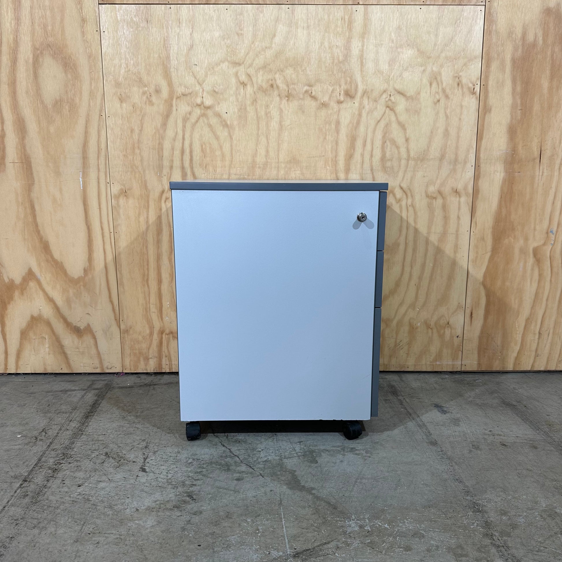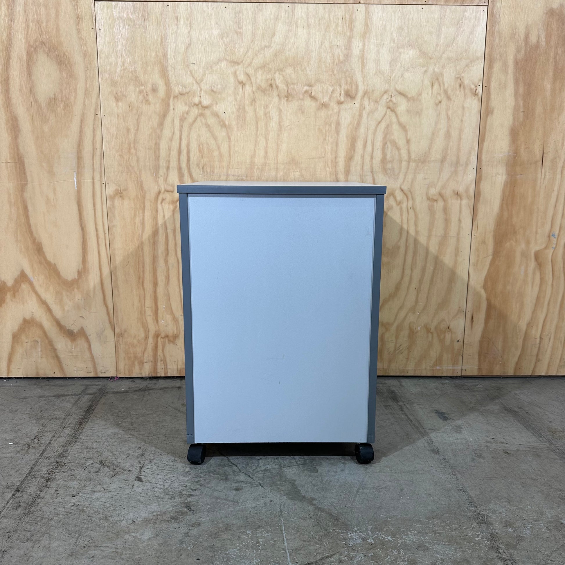 A highly functional, three-drawer mobile pedestal offers compact and secure storage for your office essentials. Constructed from durable light grey melamine, it presents a professional and clean aesthetic. Castors provide easy mobility, allowing you to position it conveniently under any standard-height desk. Each drawer has an internal steel base and smooth-gliding runners for dependable daily use. Brushed silver D-handles complement the cabinet's modern design.