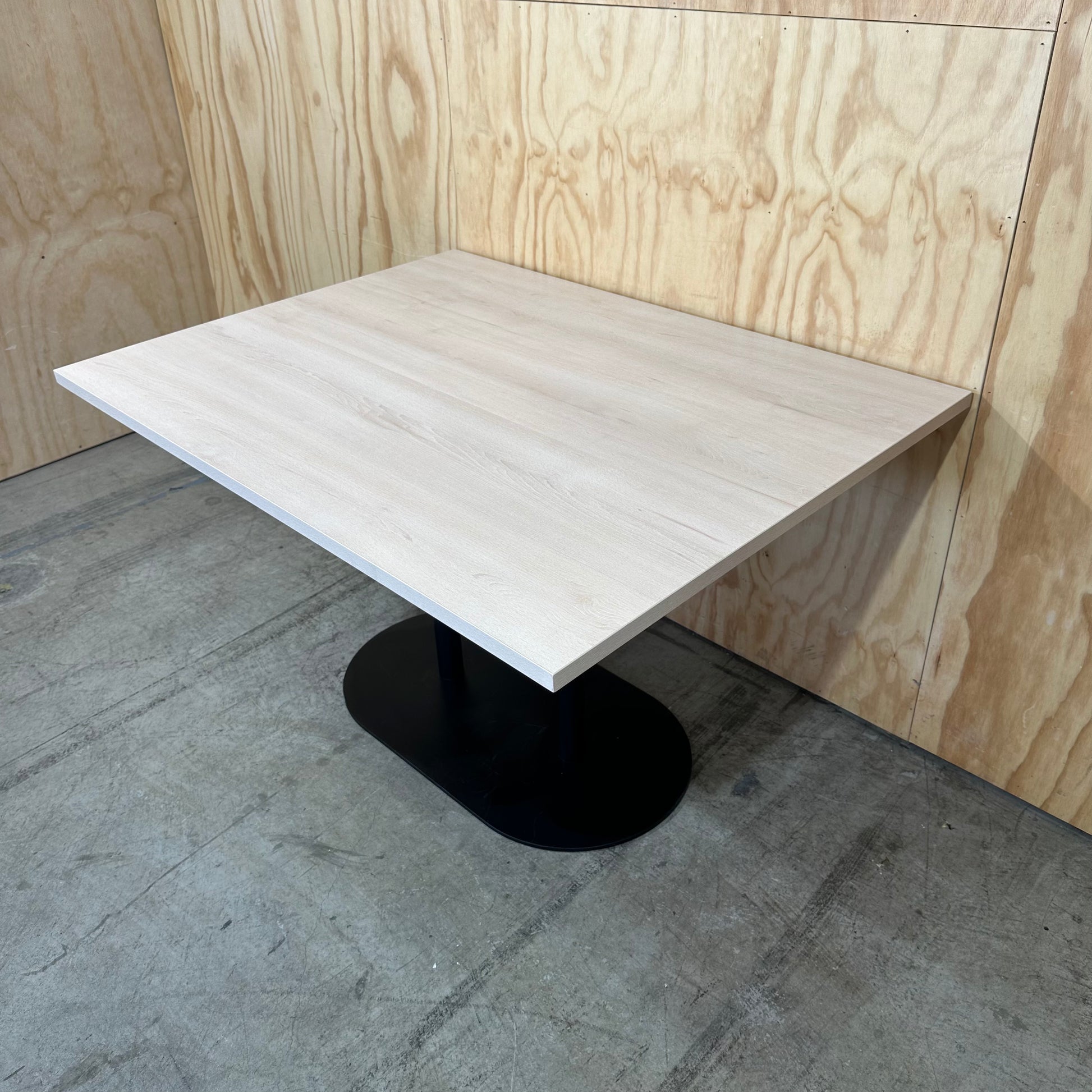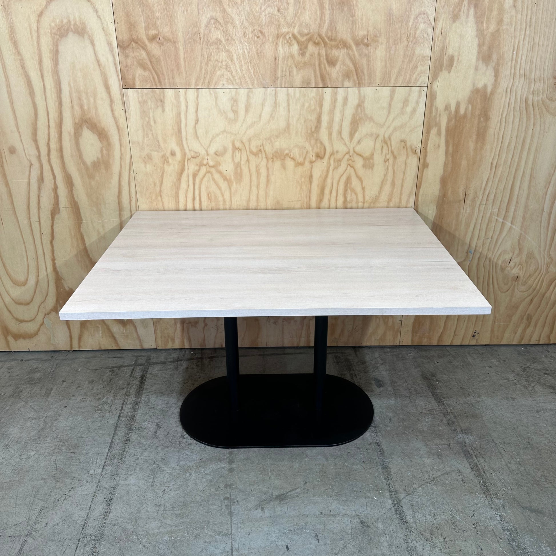 This square table offers a clean, contemporary surface. Light timber-look compact laminate forms a resilient tabletop. Black powder-coated steel pedestal base provides stability and modern contrast. Design supports heavy-duty applications in high-traffic settings. Table is commercial grade, built for sustained use and easy maintenance.