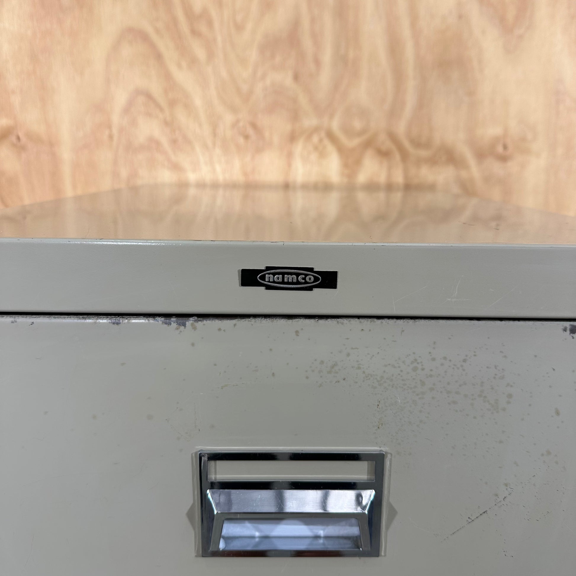 This is a classic four drawer vertical filing cabinet from Namco, presented in a neutral beige or pale grey finish. Robust steel construction ensures durability and long service life. Four generously sized drawers accommodate Foolscap suspension files, offering secure and organised document storage. Each drawer features a recessed chrome handle and a label holder for easy identification of contents. Minor wear consistent with age is visible, proving its history of reliable use.