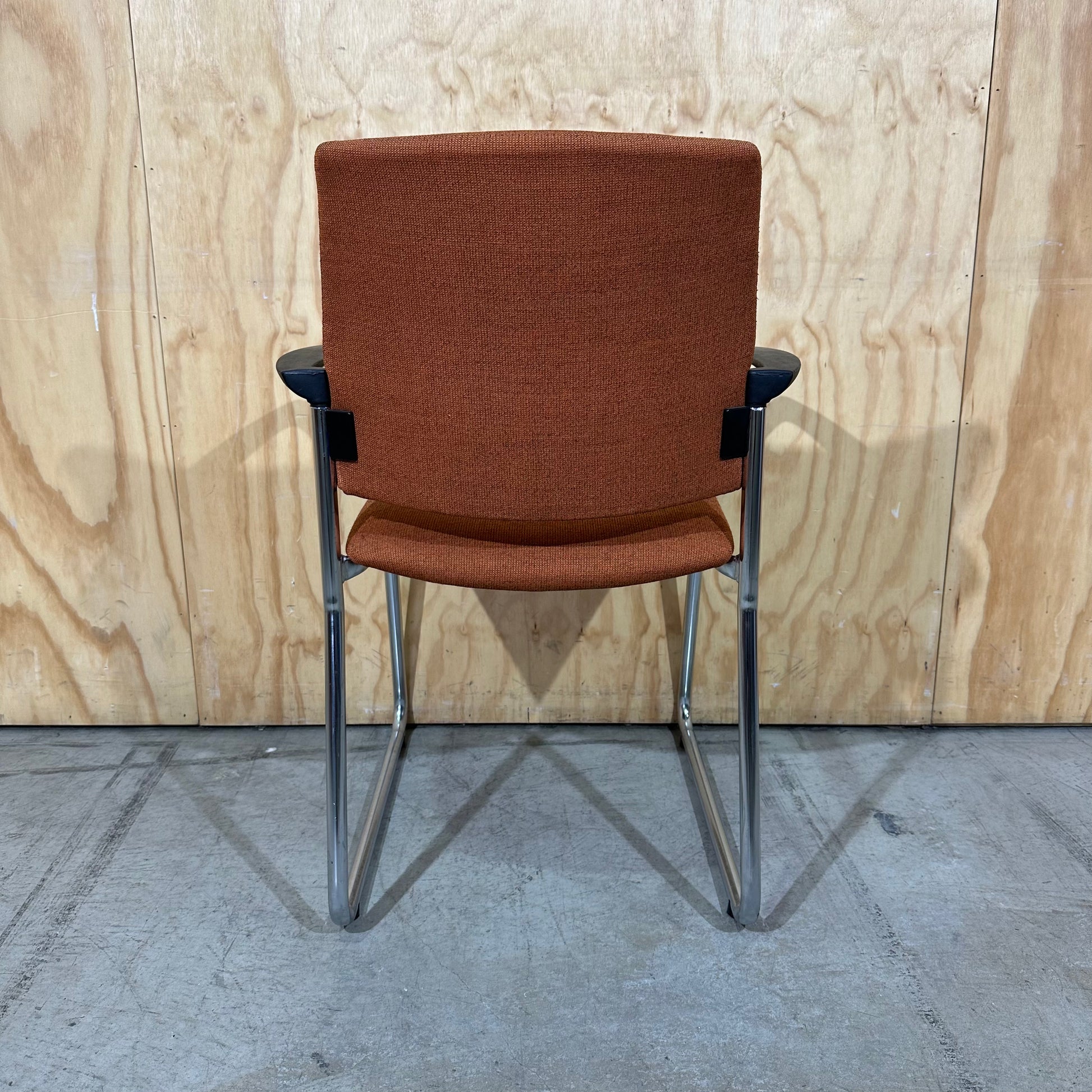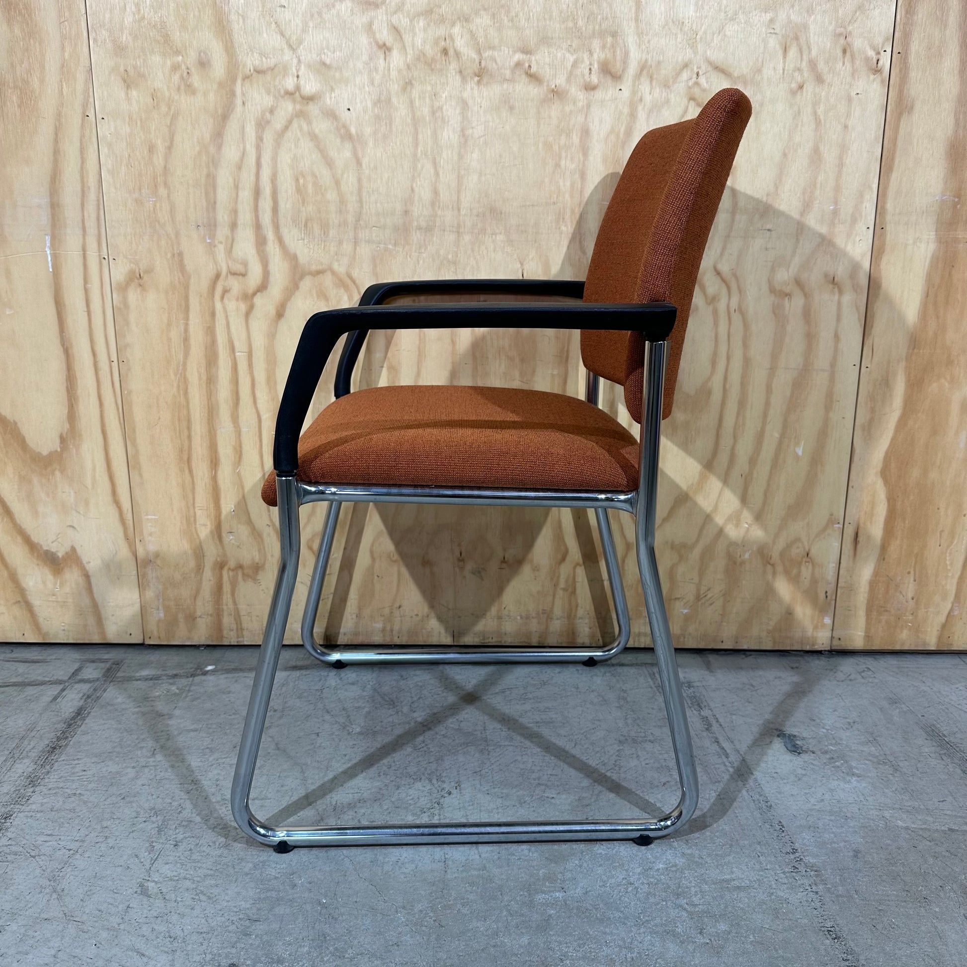 Secure a professional edge with this Prague visitor chair. A bold rust orange upholstery covers the high density foam seat and backrest, providing vibrant colour for any commercial setting. The cantilever frame uses polished chrome steel to offer a gentle flex that improves seated comfort during long meetings. Fixed black polypropylene armrests provide stable support and a sleek contrast to the chrome finish. Sturdy glides on the base protect your floor surfaces from scratches while maintaining stability.