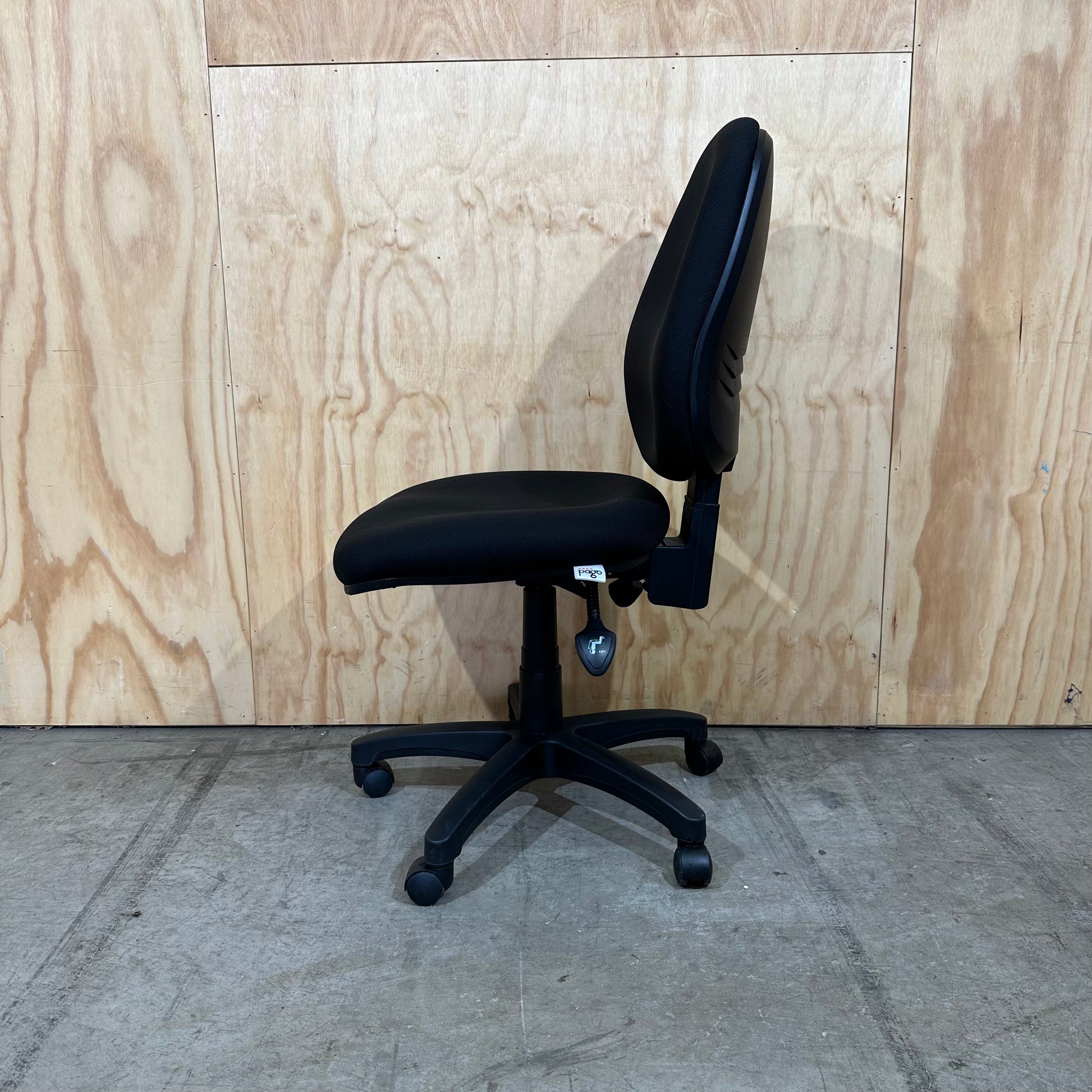 Black fabric task chair offers essential comfort and function for your daily office work. A contoured, medium-height backrest provides support for your mid-to-upper back, promoting good posture. Adjust the seat height with the gas lift mechanism to find your optimal ergonomic position. Control the chair's back tilt tension to suit your movement preference. A simple, robust design suits frequent, everyday use.