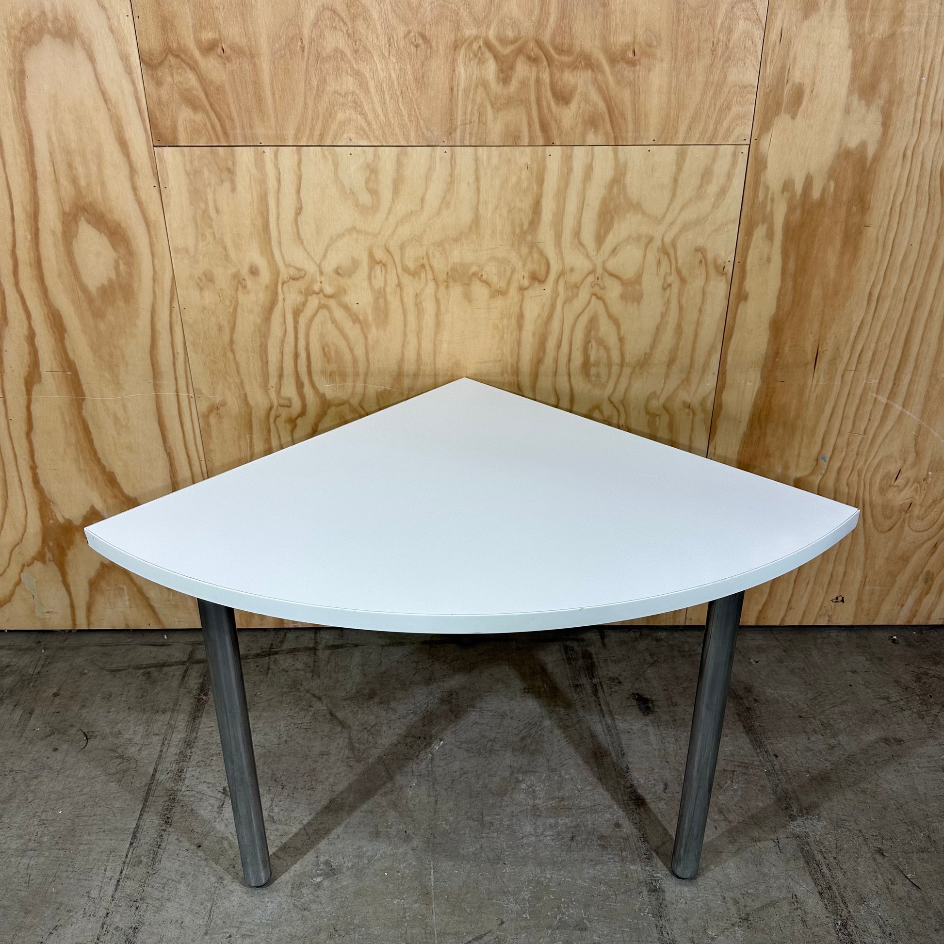 Acquire this brilliant space-saving quarter round extension desk top, an exceptional solution for maximising utility in tight corners. White melamine finish offers a bright, clean aesthetic that integrates with any modern decor. Metal A-legs provide sturdy support and an industrial touch. Surface shape provides a compact yet functional workspace for your laptop or display items. Its standalone design allows you to position it where you need extra surface area without consuming excessive floor space.