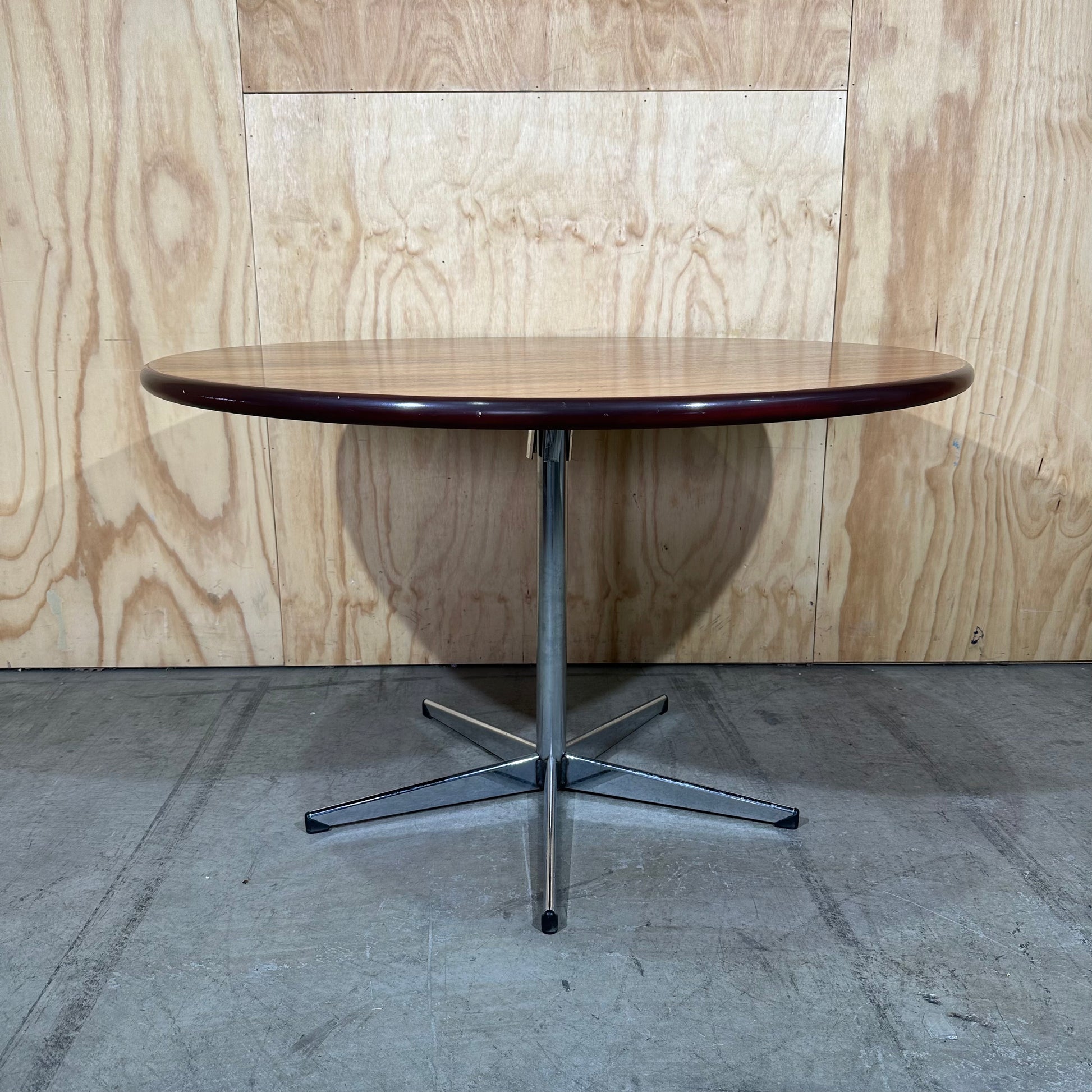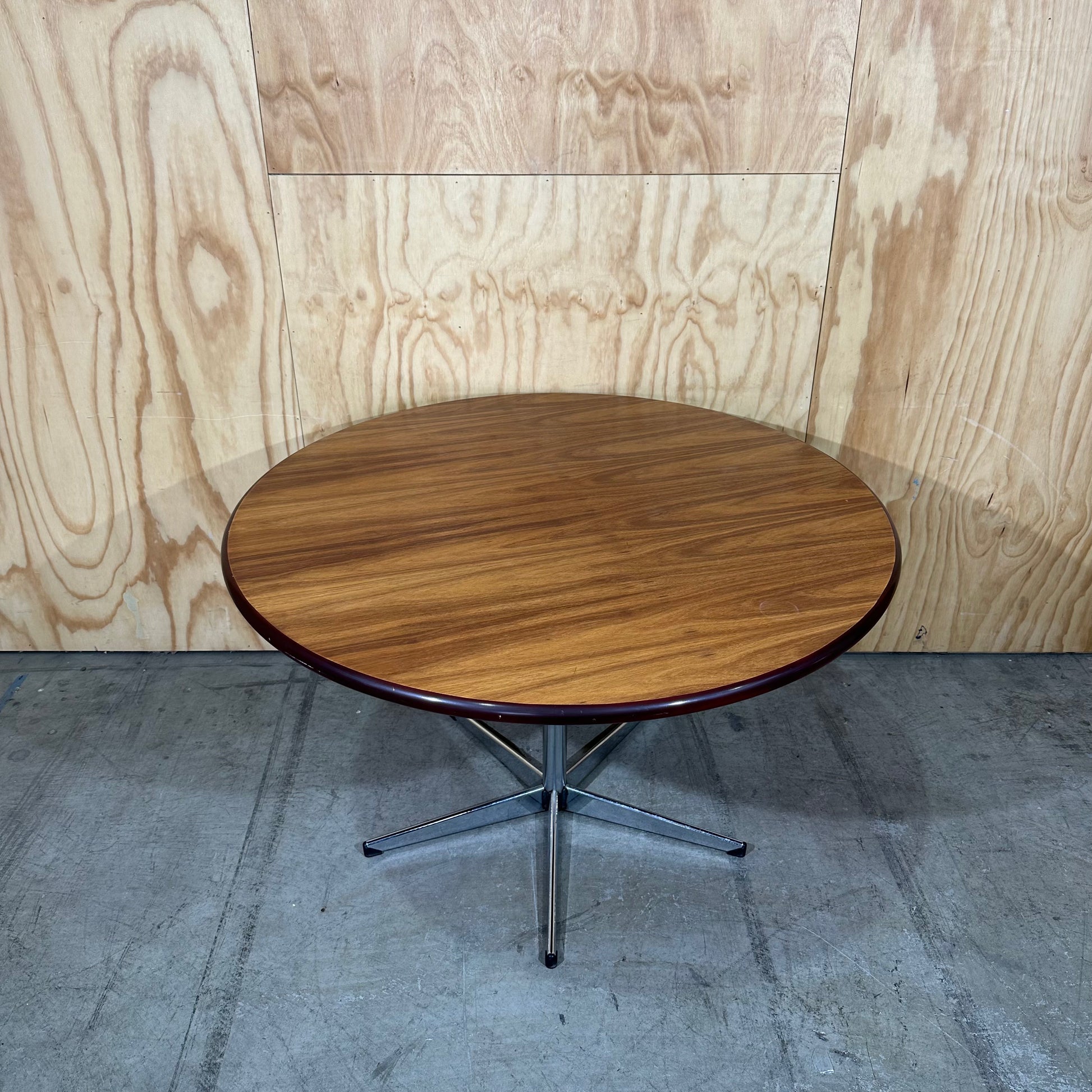 Bring this classic mid-century design into your living space. Round walnut veneer top provides a warm, inviting surface. Table sits atop a striking, polished chrome trumpet pedestal base. Distinctive chrome base offers maximum leg room and visual lightness. Design blends organic curves with sleek metallic structure, a signature of the 1960s aesthetic. Use provides a generous and functional area for drinks, books, or decor.