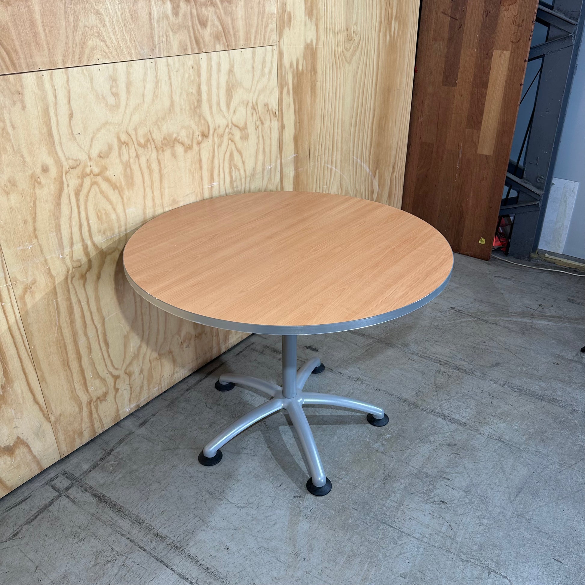 Secure a professional hub for your office with this round meeting table. A light beech melamine top provides a hardwearing surface resistant to scratches and heat. The thick worktop ensures structural integrity during heavy daily use. Supporting the unit is a heavy duty five star silver base equipped with adjustable levelling glides. These glides allow for a perfectly flat surface on uneven floors or carpet. The central pedestal design maximises legroom for all users by removing corner obstructions. This table facilitates clear communication for up to four people in any collaborative setting.
