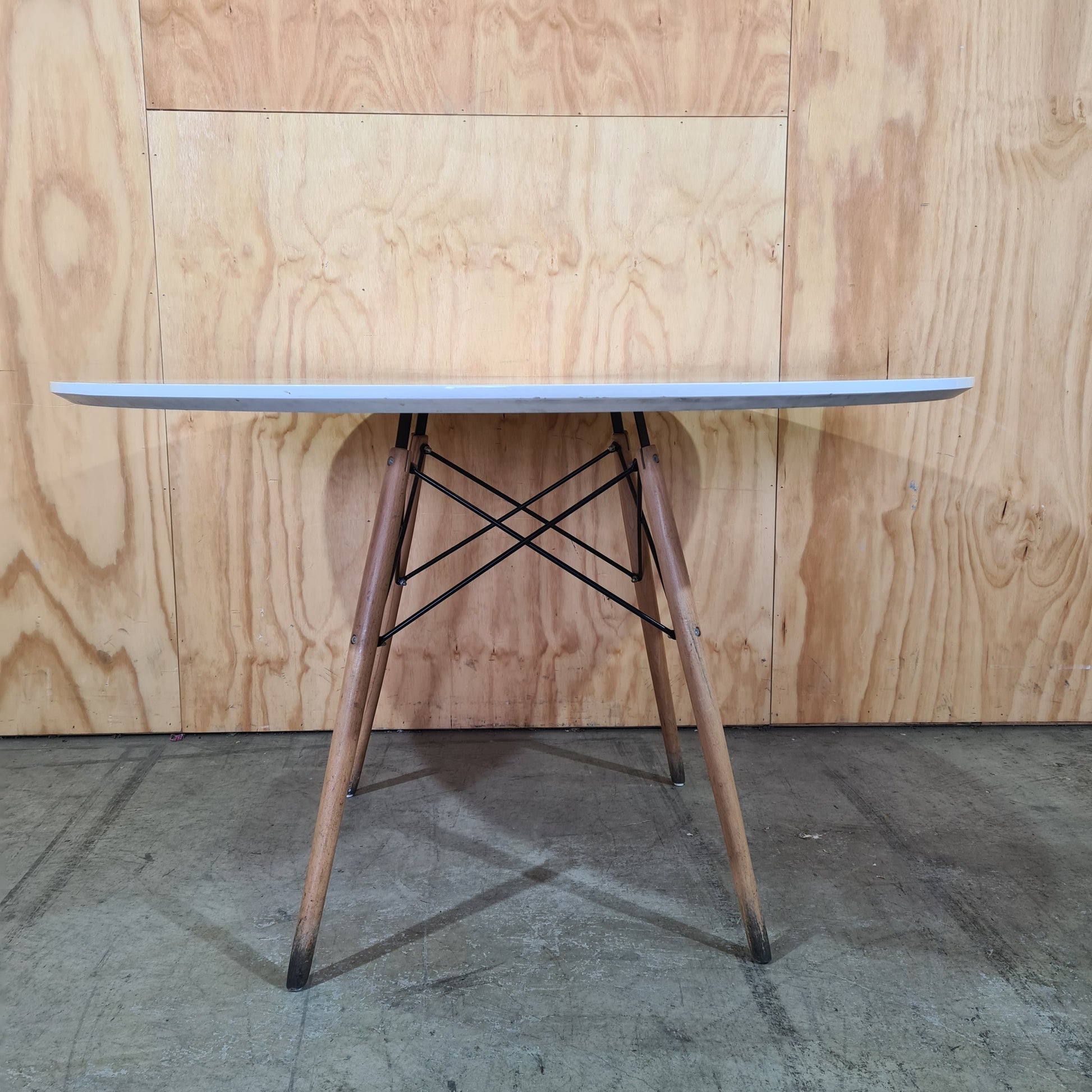 A clean, circular white top pairs seamlessly with the iconic 'Eiffel' base, offering a mid-century modern aesthetic. Sturdy, splayed beech wood legs and black steel cross-wires provide a stable foundation and a striking contrast to the smooth tabletop. Its compact footprint and open base structure ensure light flows freely, making your space feel larger and more airy. Purchase this table to introduce a timeless, functional design piece into your home.