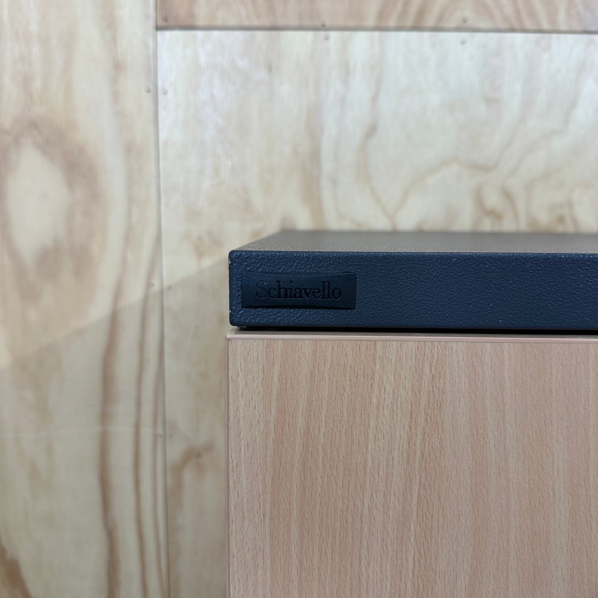 Secure essential documents with a professional-grade storage solution. You are viewing a Schiavello 3 drawer lateral filing cabinet finished in a light beech woodgrain laminate with charcoal trim and base. This unit offers substantial storage capacity, accommodating foolscap suspension files laterally across the width of each drawer. Each drawer features a curved metal pull handle and operates on heavy-duty runners. Construction is solid, reflecting the quality expected from a premier office furniture manufacturer.