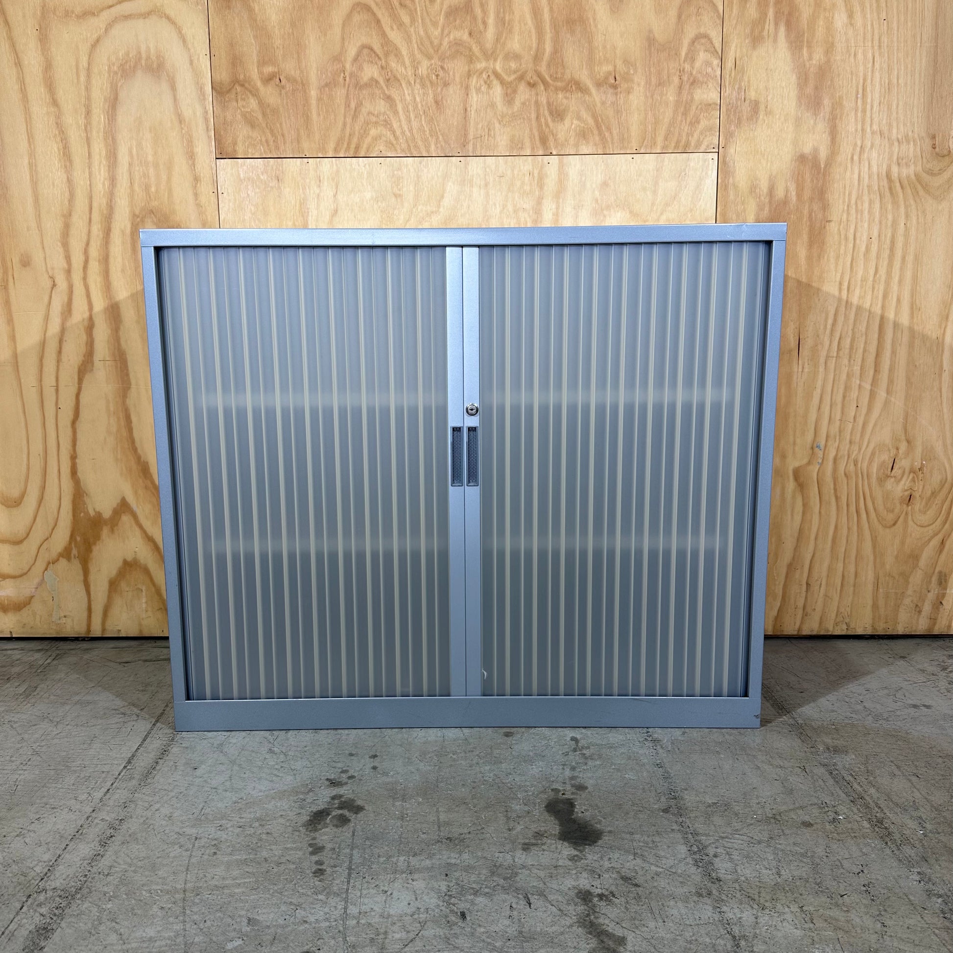 This silver grey storage unit features a robust steel body and translucent slats. Vertical slats retract fully into the cabinet sides to ensure they do not obstruct walkways or narrow corridors. Your office remains organised thanks to the adjustable internal shelves.