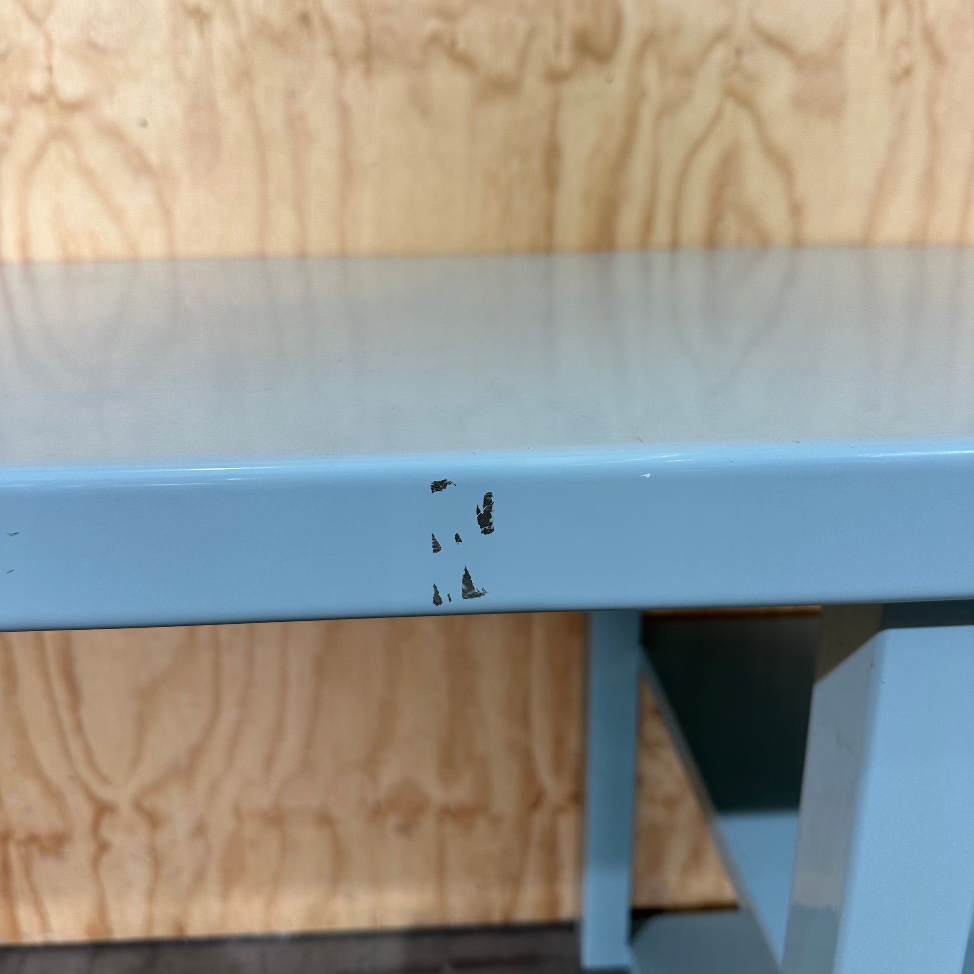 This vintage-style metal desk features a striking teal finish, giving industrial utility a vibrant contemporary edge. Desk has a solid top surface, supported by sturdy metal legs and a practical integrated shelving unit on the right side. Shelving provides open storage for books, files, or equipment, maximising your workspace efficiency. You are buying a durable, functional piece with genuine utilitarian character. The desk offers a generous work area and robust construction, built to withstand daily use in a busy environment.
