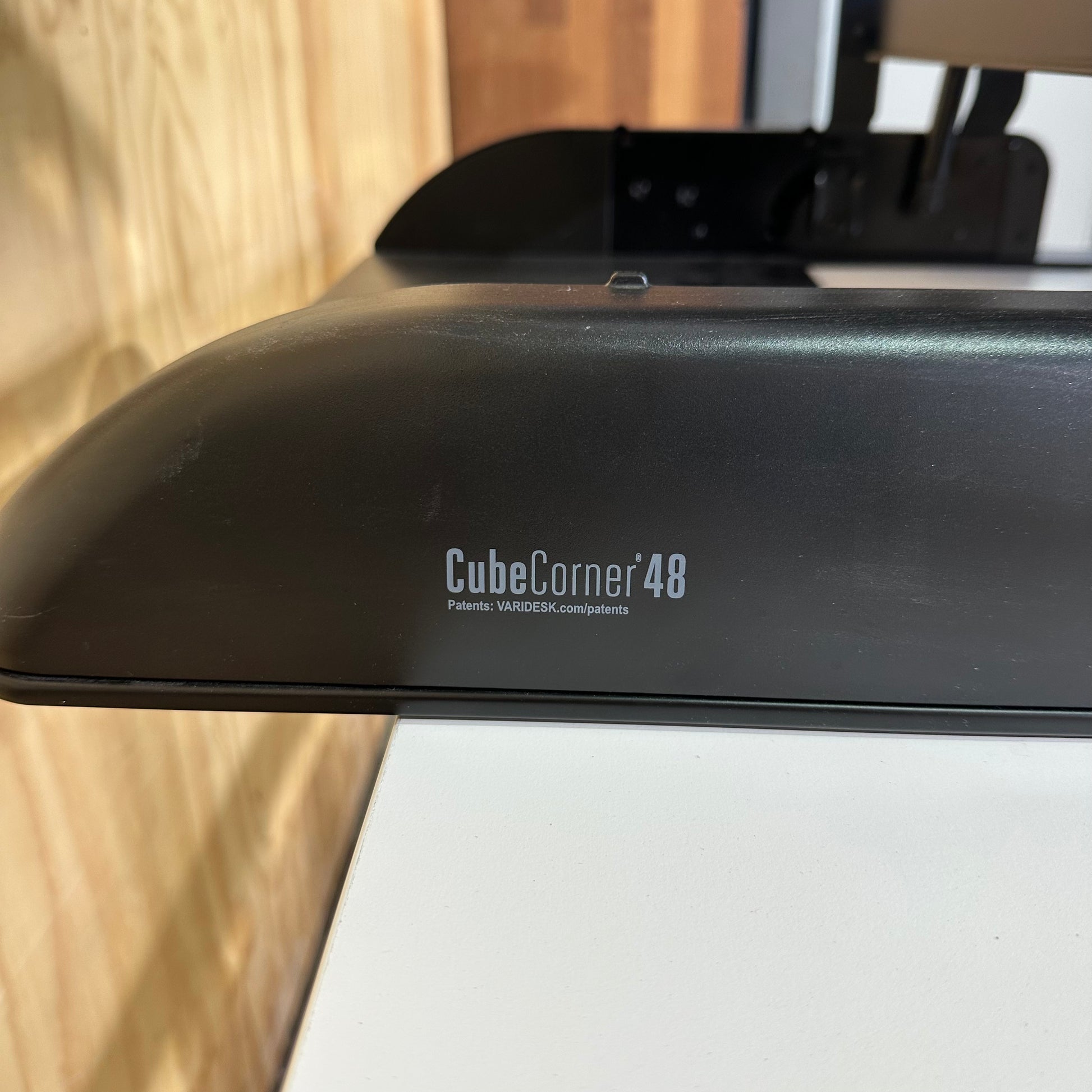 The item is a VariDesk Cube Corner 48, a black, two-tier sit-stand desktop converter. This unit is specifically designed to fit into L-shaped or corner desk configurations, maximising usable workspace. A patented spring-loaded lifting mechanism allows for quick, effortless transitions between sitting and standing. The dual-handle design offers simple height adjustment through a number of different settings. The large upper display surface comfortably accommodates dual monitor setups, and a lower deck provides ergonomic placement for your keyboard and mouse. The unit arrives fully assembled, ready for immediate use on top of your existing desk.