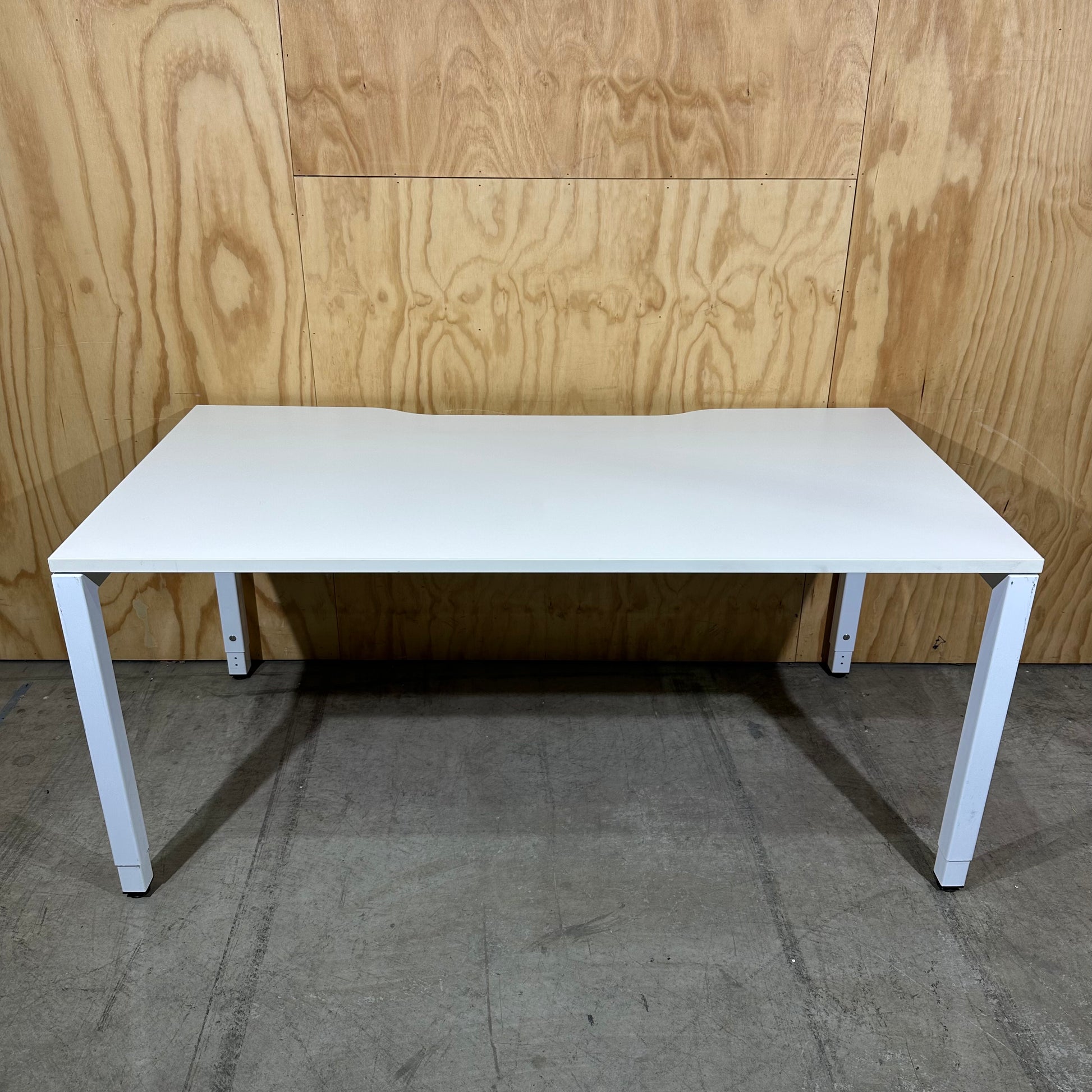 Acquire a clean, functional workspace with this contemporary white desk. A smooth, spacious laminate desktop provides ample room for monitors and accessories. The sturdy square-profile metal legs, finished in a matching white powder coat, offer excellent stability. A subtle scalloped cutout along the rear edge assists with simple cable management, helping you maintain a neat setup. Straight lines and a monochromatic colour scheme deliver a modern, simple aesthetic that complements any decor.