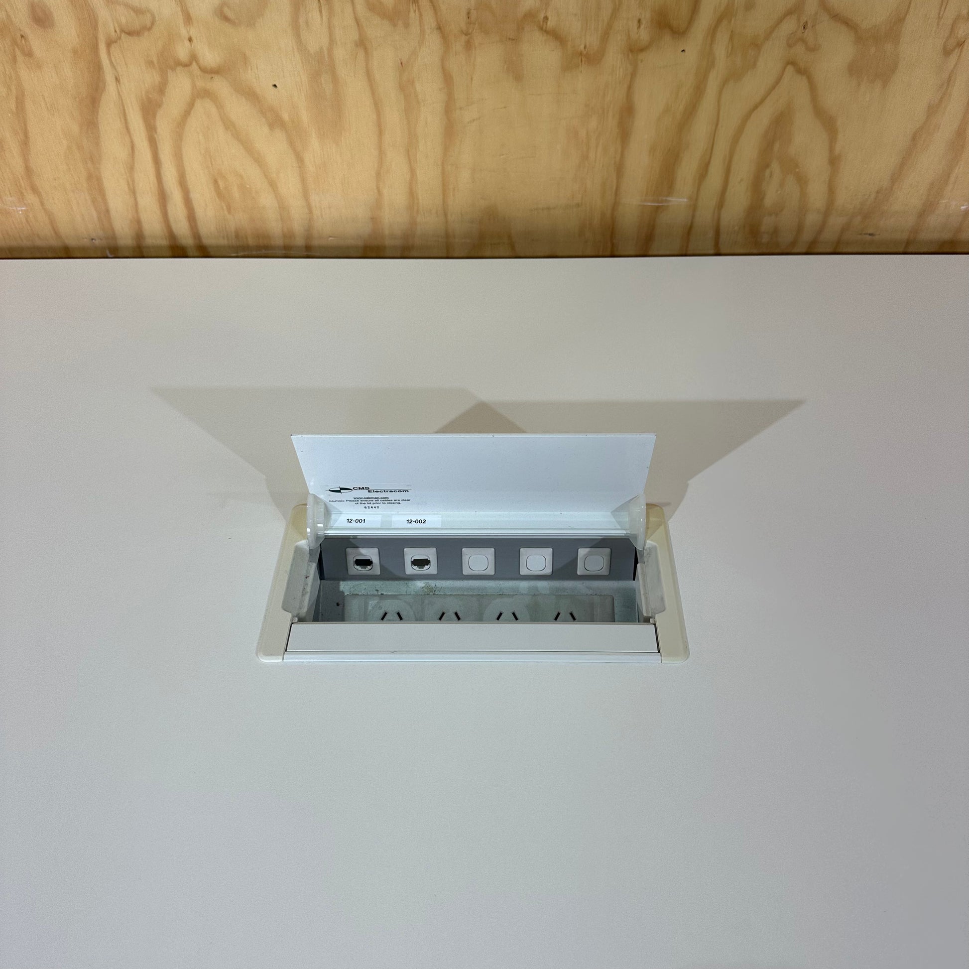 Maximize your productivity with this professional desk. Its expansive white surface provides a clean and durable workspace suitable for demanding daily use. A central aluminium flip top hatch allows you to manage power and data cables efficiently. Four silver tubular steel legs provide a stable and level foundation on any flooring surface. This furniture piece serves as a reliable anchor for a high performing executive office or a sophisticated home study.
