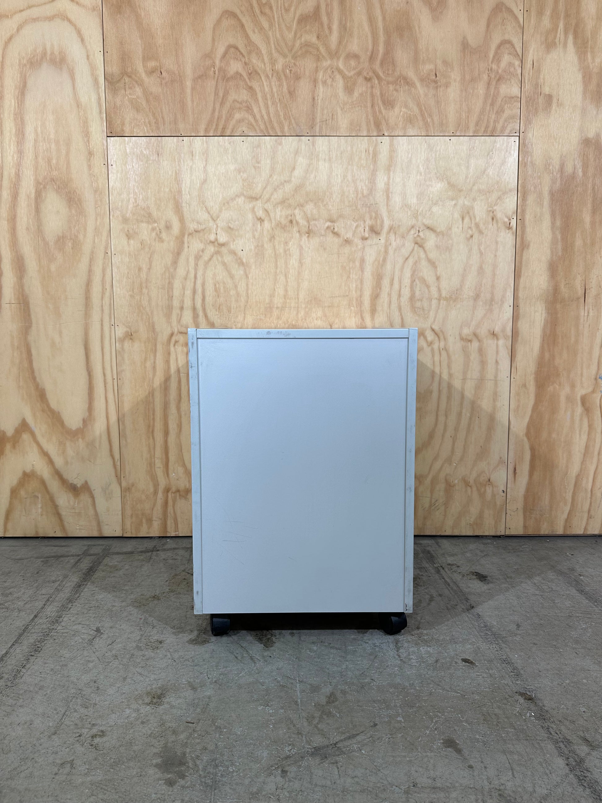 This is a functional three-drawer mobile pedestal, finished in clean white laminate. It offers two shallow stationery drawers and one deep filing drawer, providing essential under-desk storage. Each drawer features a sleek black pull handle and smooth runners for easy access. Pedestal rests on non-marking castors, allowing you to move it easily across your workspace. A lock mechanism is present, securing all three drawers for confidential documents and personal items. Construction uses durable, business-grade materials, ensuring longevity in an office environment.