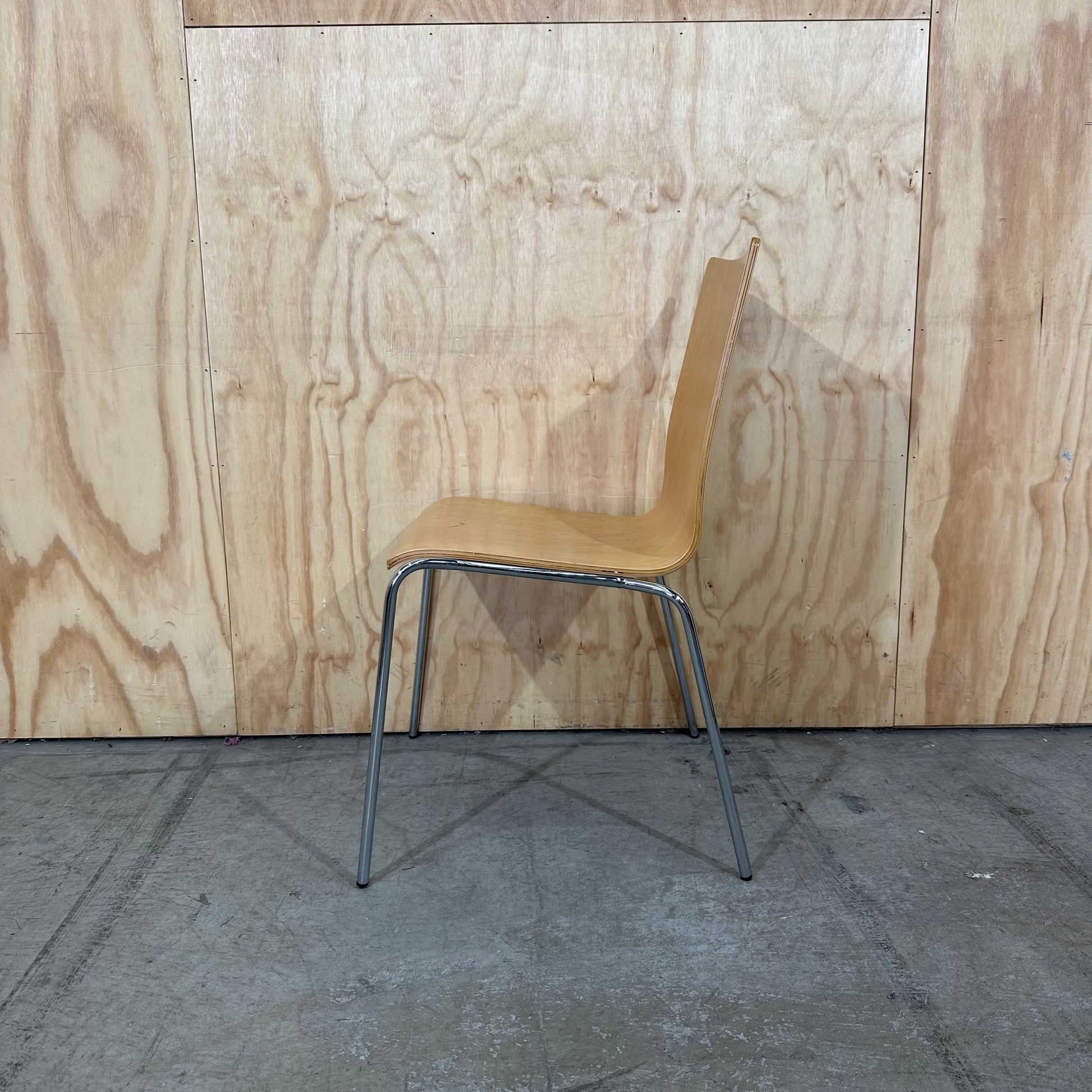 The chair features a single, fluid piece of pressure-moulded bent plywood for the seat and back, mounted on a base of four slender, chromed steel legs. The light veneer finish highlights the natural grain of the wood, and the form is instantly recognisable as a cornerstone of mid-century modern design. The gently curved shell provides surprising ergonomic support and comfort. Its stackable design makes it a practical choice for both home and commercial use.