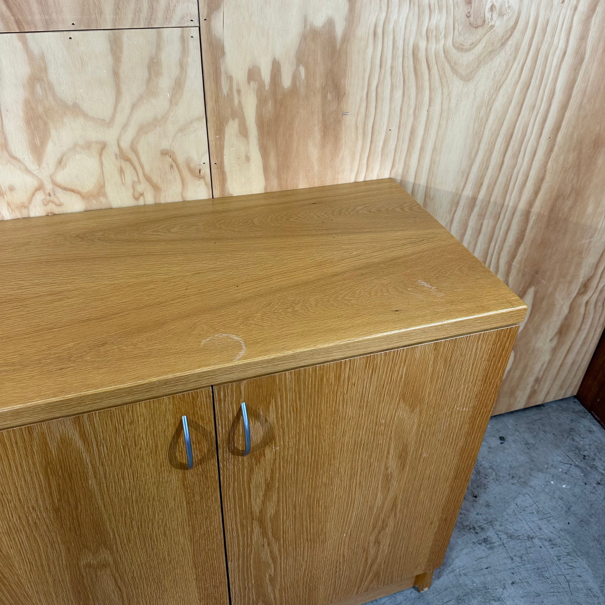 This is a contemporary wooden sideboard, likely featuring an oak or ash veneer finish. The piece presents a sleek, low-profile silhouette typical of modern design, offering practical storage with clean lines. You see two side cupboards with doors, flanking a central section containing a drawer over a recessed shelf, perfect for electronics or display items. Recessed handles maintain the cabinet's minimalist aesthetic. Its light natural timber tone adds warmth to any interior.