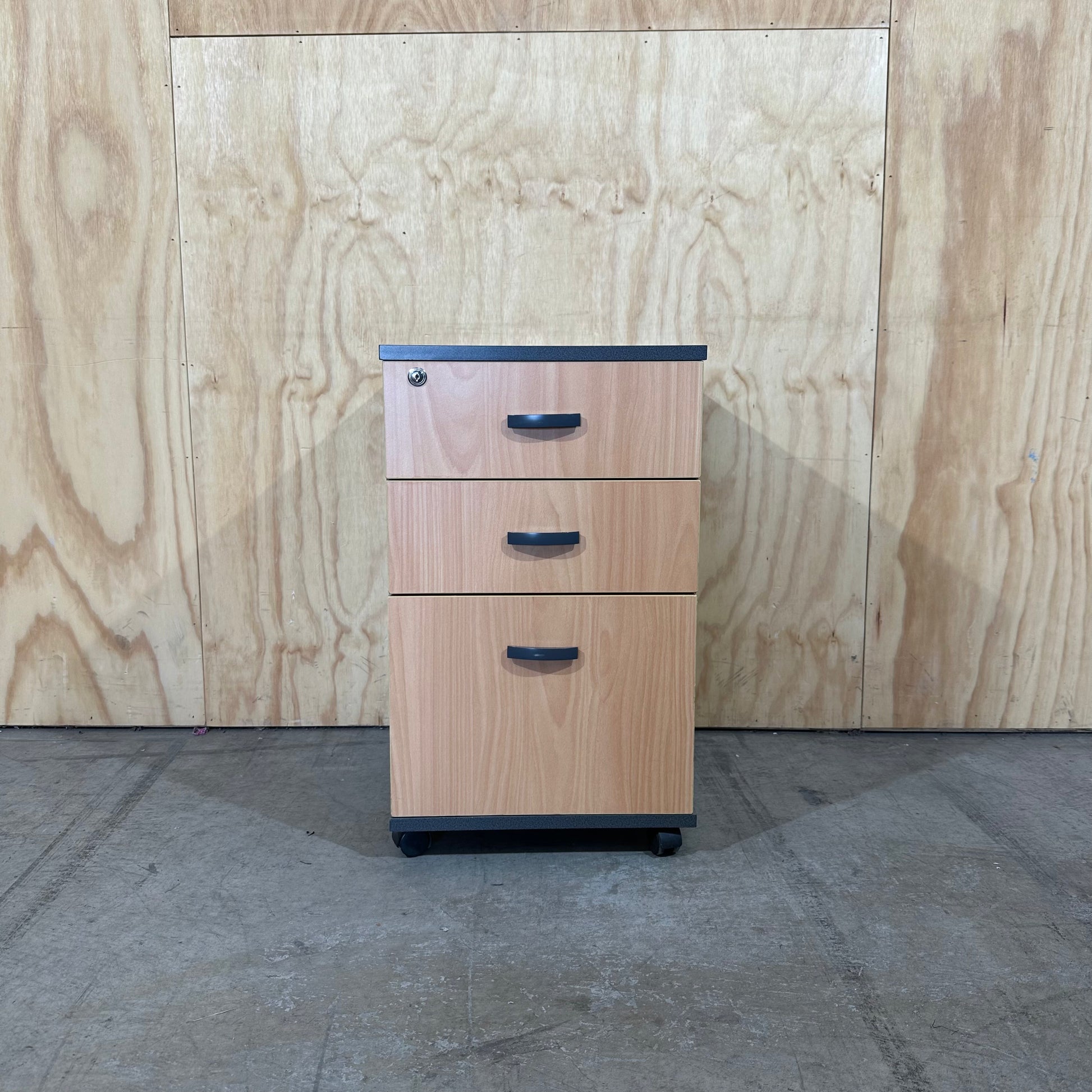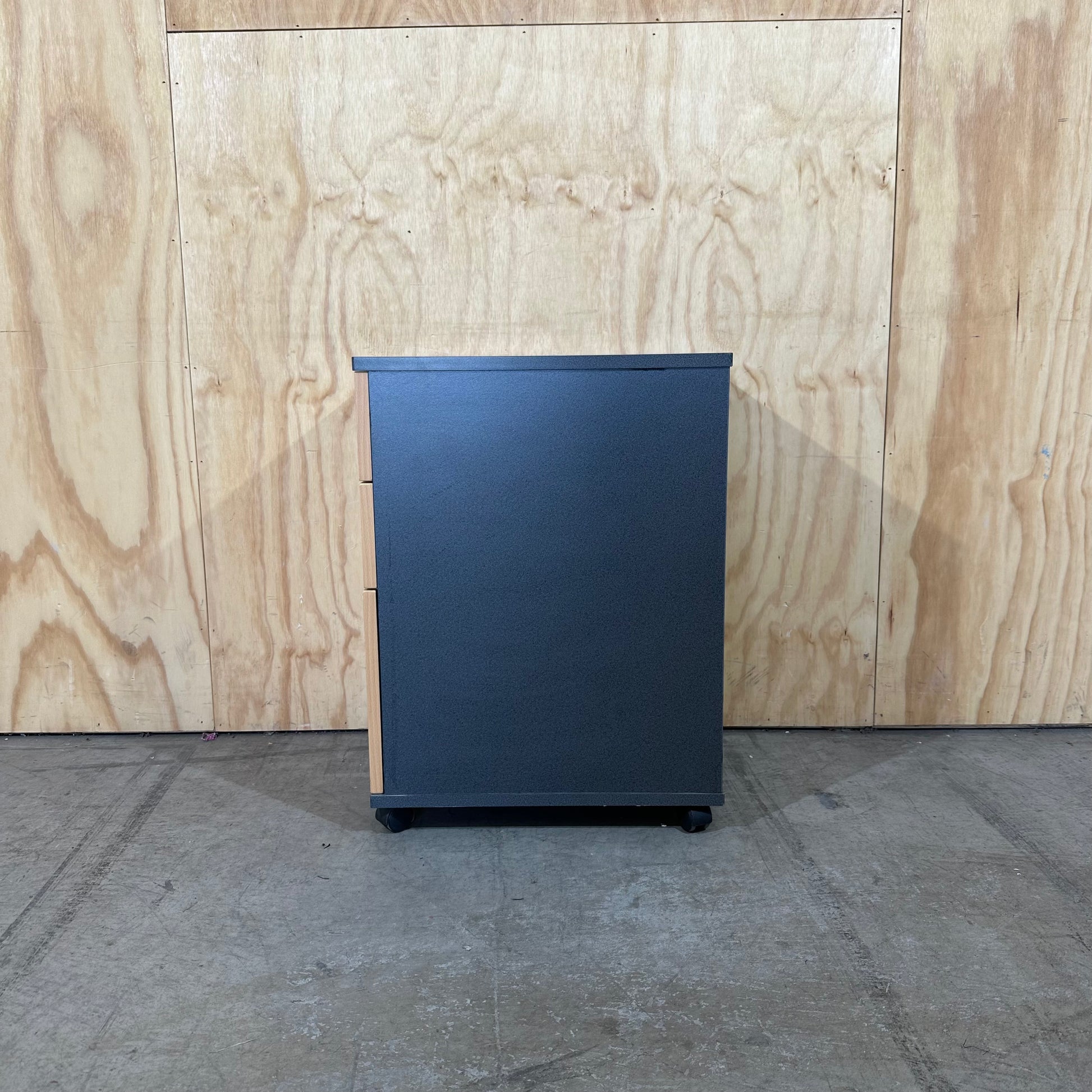 This is a versatile, lockable mobile pedestal designed for efficient office storage. It features two shallow personal drawers and one deep file drawer, ideal for organising your daily essentials and hanging files. The unit presents with a stylish two-tone finish, pairing a dark charcoal body with light cherry or oak veneer drawer fronts for a contemporary contrast. Five castor wheels provide excellent mobility and stability, allowing you to move the storage easily within your workspace.