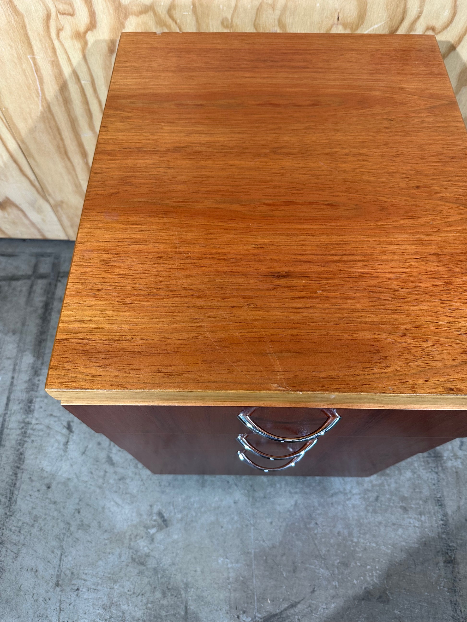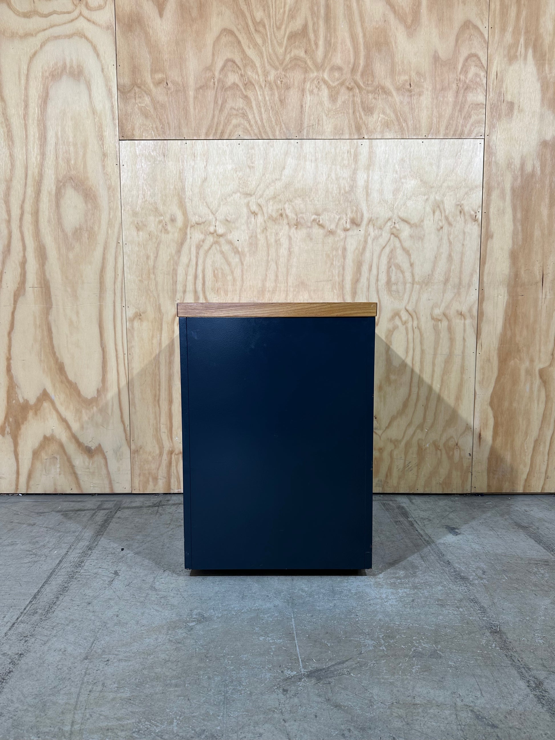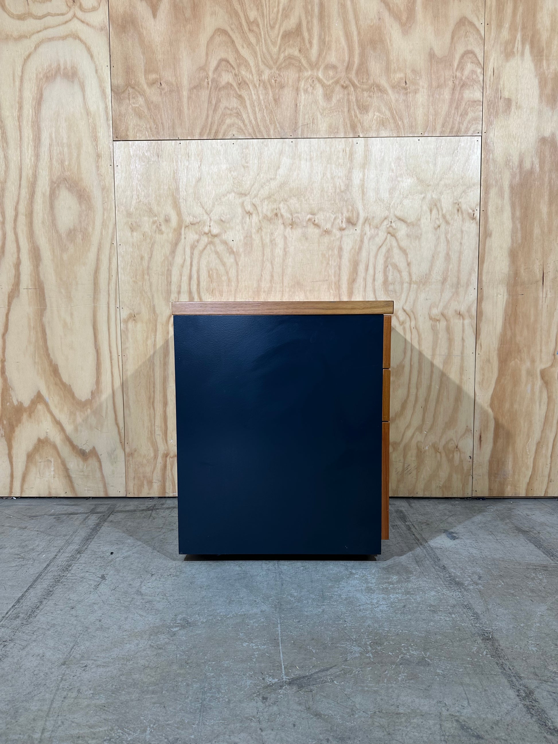 This sturdy three-drawer fixed pedestal offers a professional storage solution for your workspace. Constructed from quality melamine boards, a rich cherry wood veneer finish contrasts sharply with the deep charcoal body, providing a modern, executive aesthetic. Full extension runners ensure smooth operation of all drawers, with the bottom drawer designed to accommodate foolscap filing. Each drawer features a sleek, curved chrome handle, providing both functionality and a sophisticated visual detail.