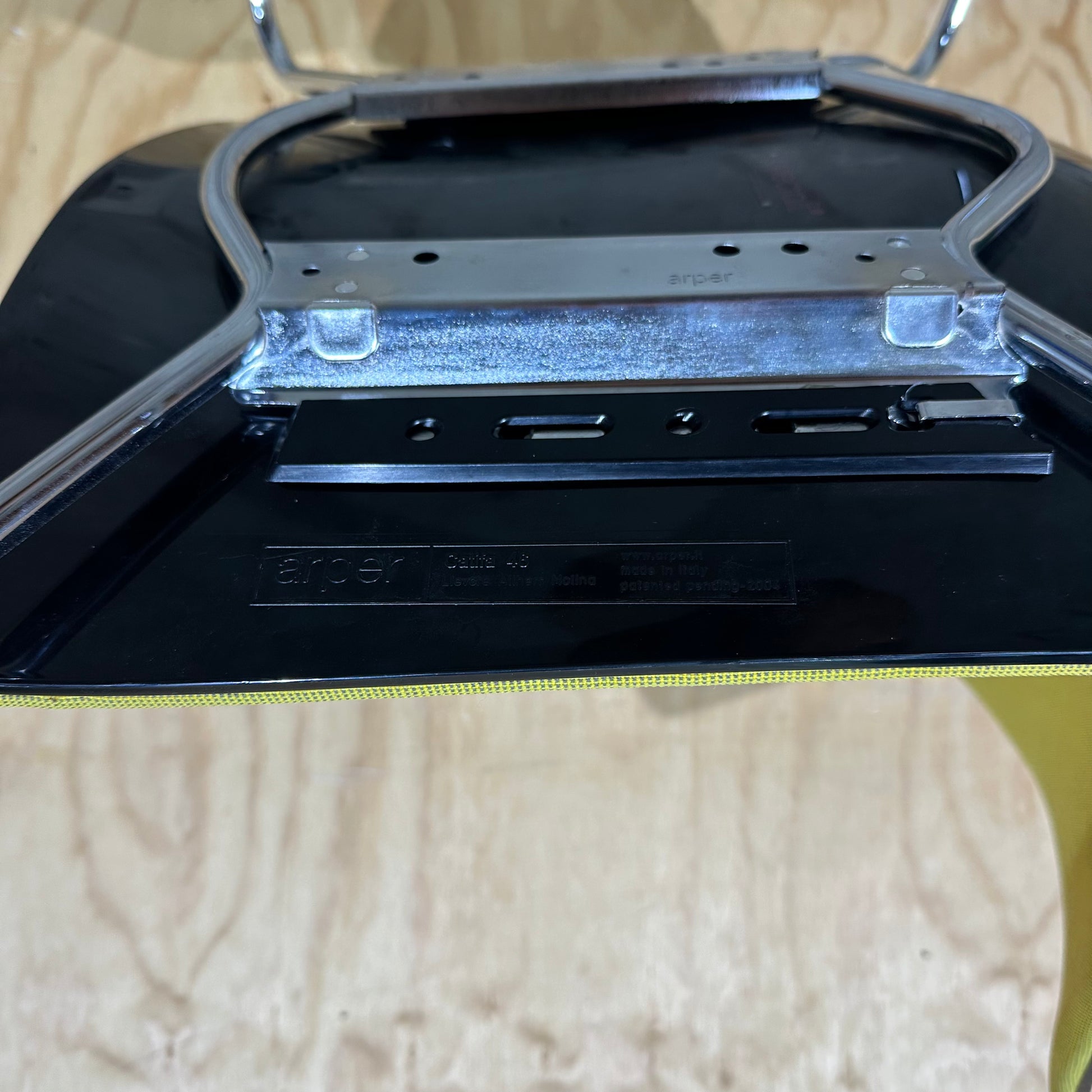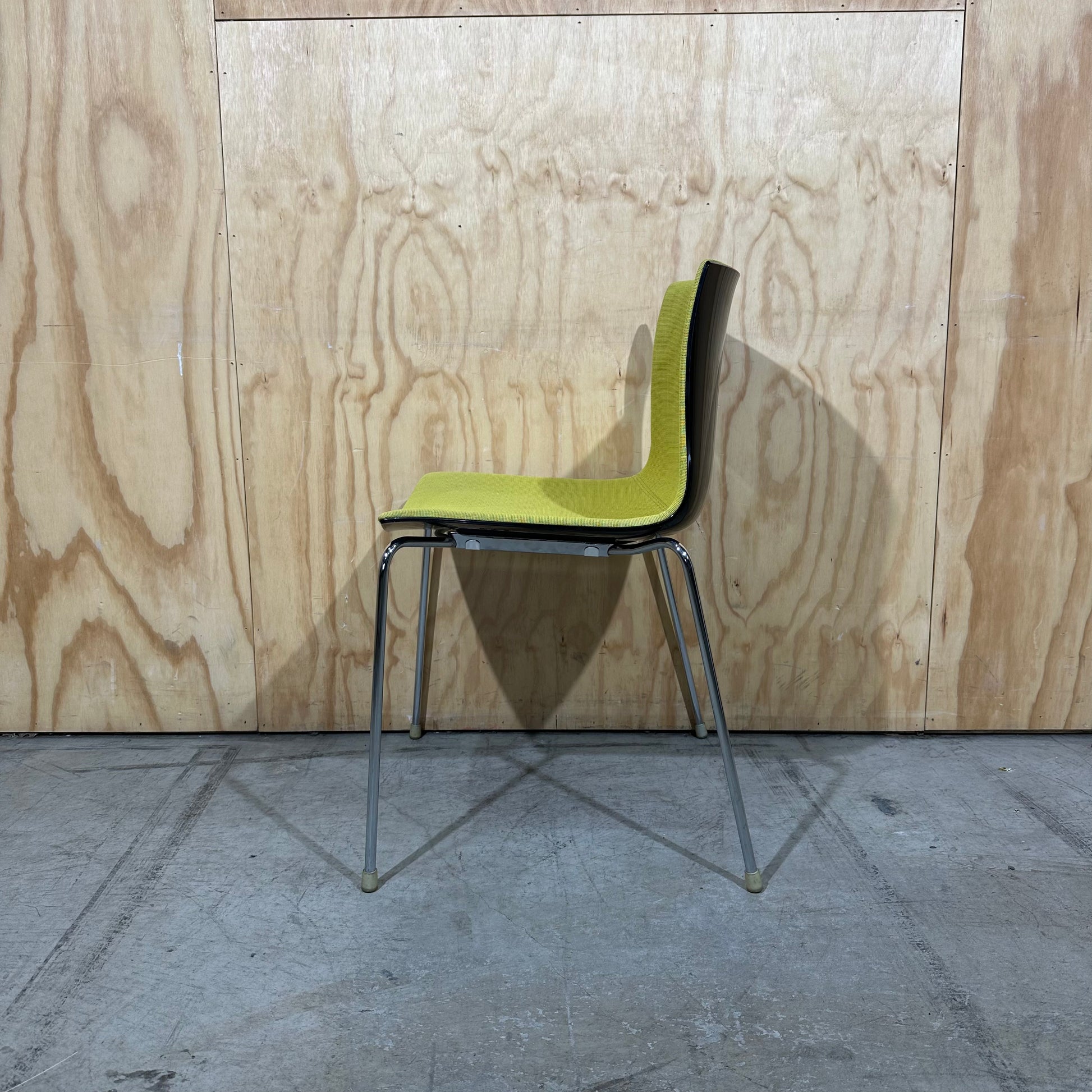 Selected for its vibrant lime yellow fabric and sleek chrome profile, this Arper Catifa 46 chair offers a refined take on modern seating. The fully upholstered shell features a slim, sculpted silhouette designed for ergonomic support and visual lightness. Sturdy chrome legs provide a high polished finish while ensuring durability for daily use. Your space benefits from the stackable design, allowing for convenient storage when you require extra floor area. Clean lines and contemporary materials make this piece a standout addition to any interior.